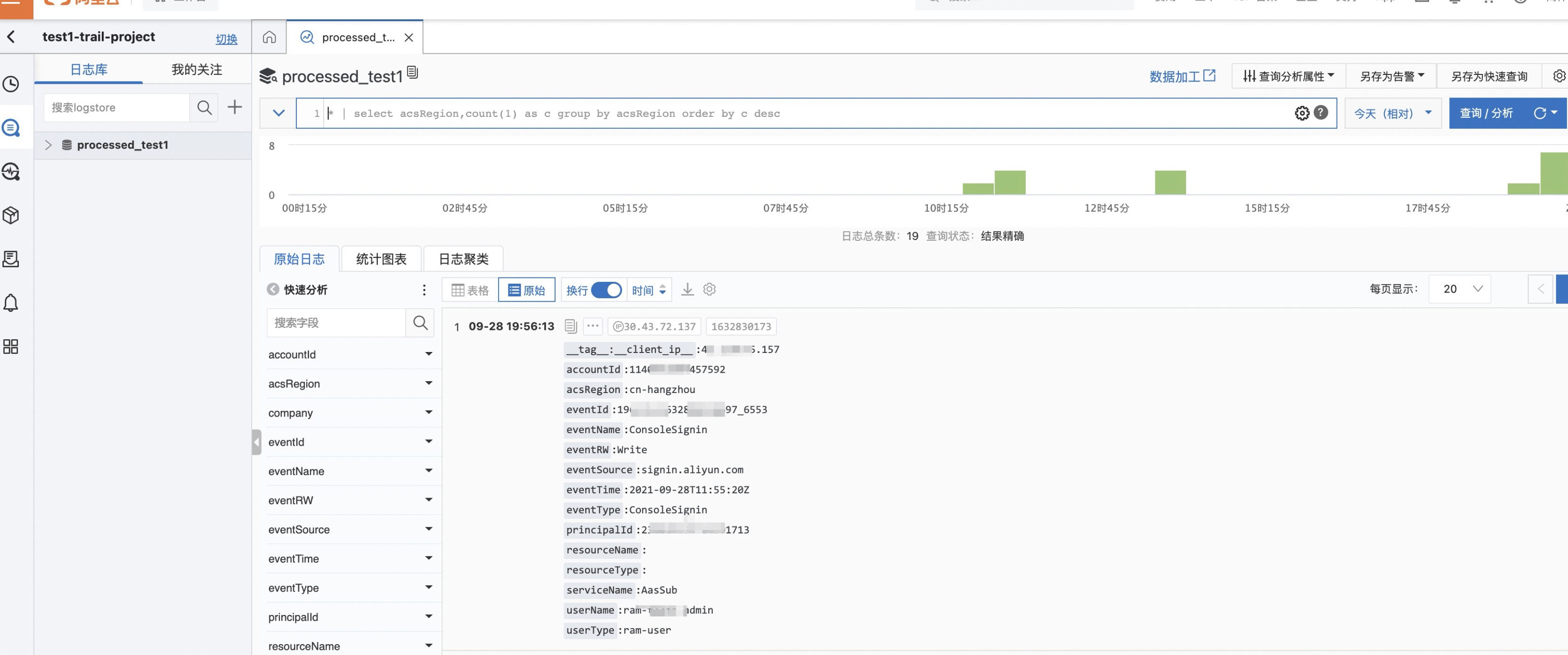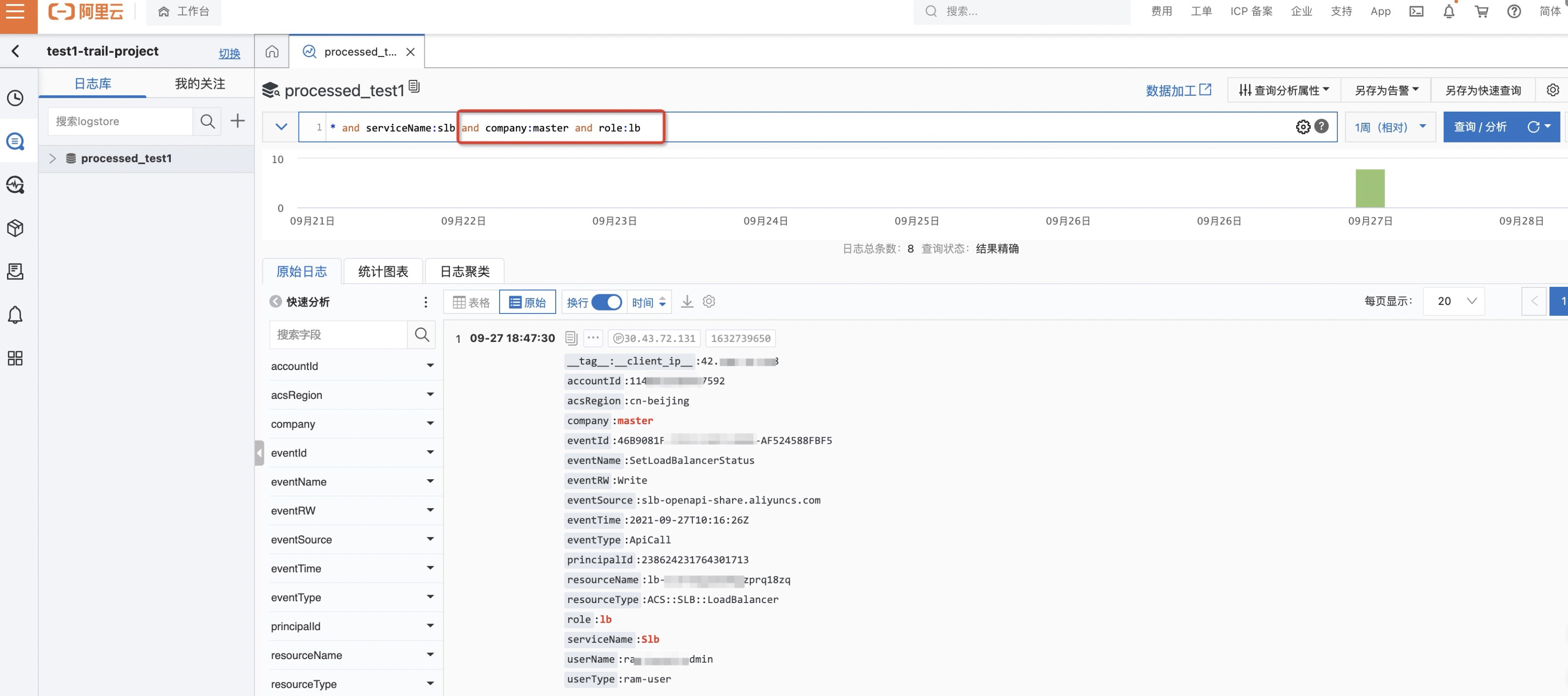 - 验证资源变更日志数据写入。对SLB、ECS进行变更类操作后等待片刻,可按资源类型及标签等字段查询处理后的日志。