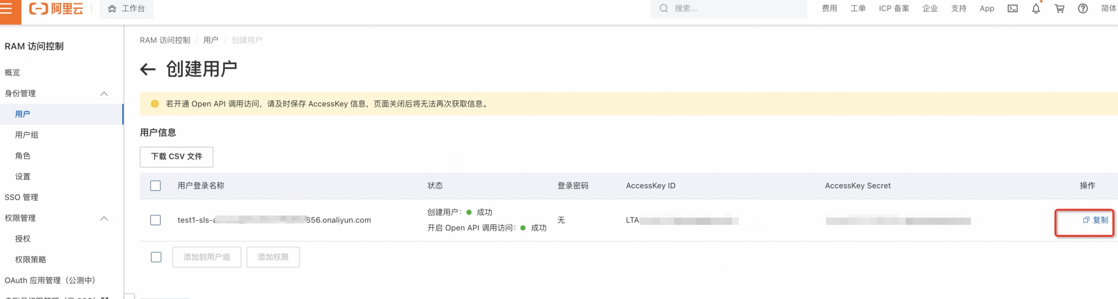 - 需要使用日志审计账号下RAM用户的AccessKey,该RAM用户需要拥有SLS的读取及写入权限,用于监听日志消息及写入处理后的日志。