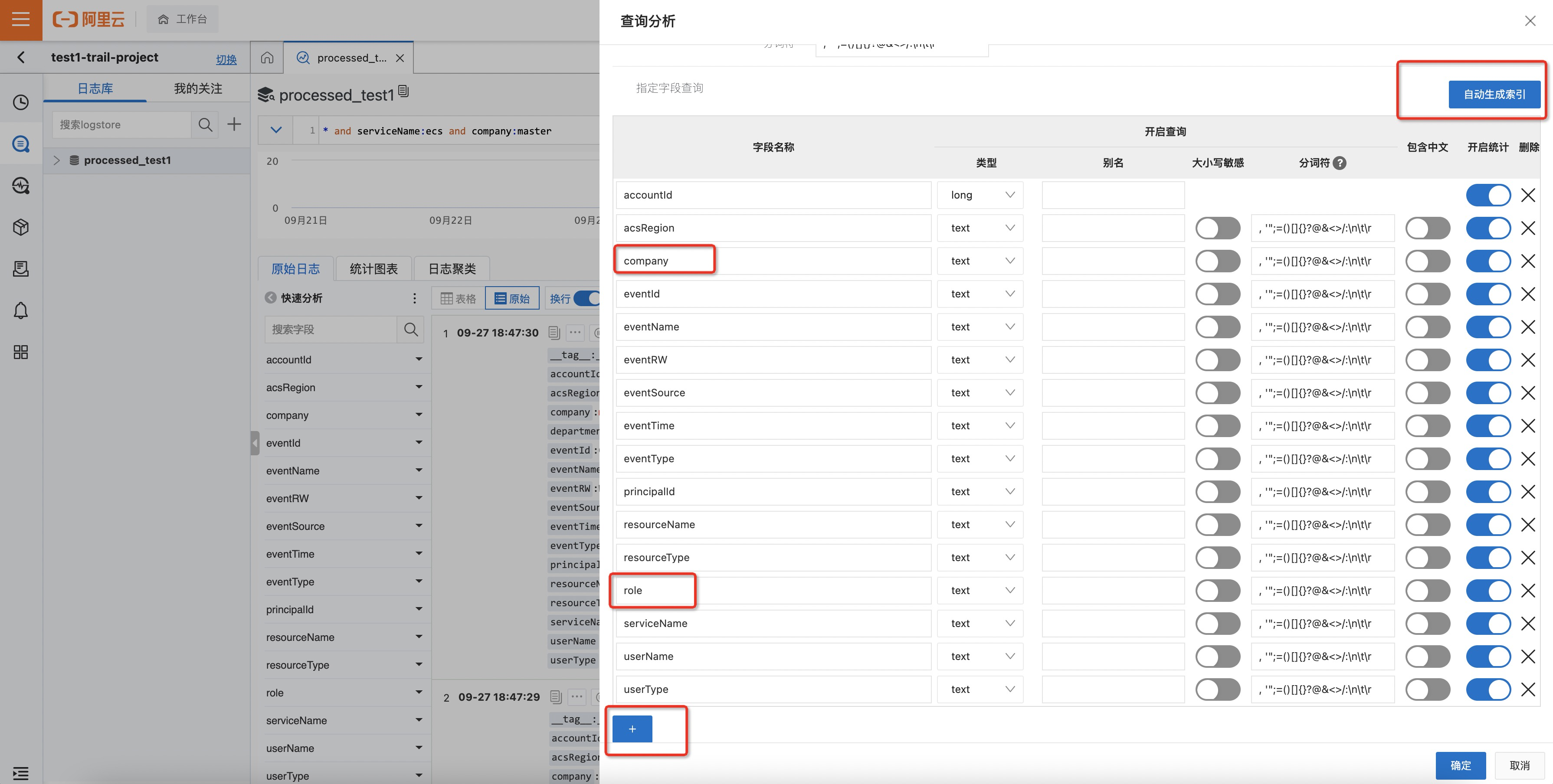 - 建立字段索引,用于支持单字段查询分析。如果是标签字段,点击自动生成索引后可能无法自动出现在列表内,需要点击“+”号手动添加标签Key到列表中,例如company、role标签。
