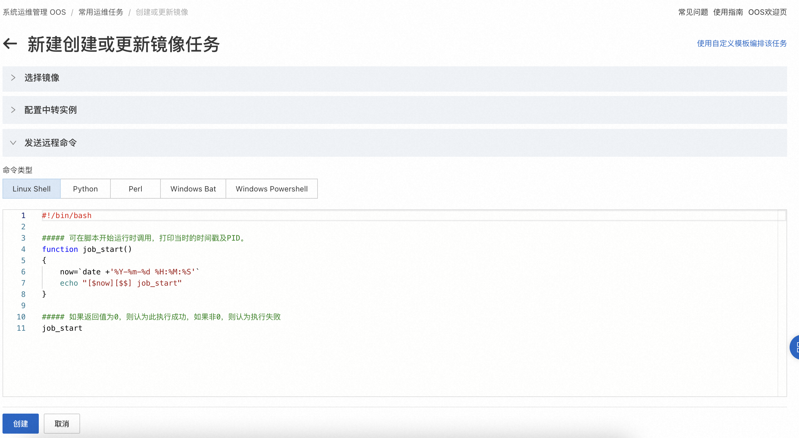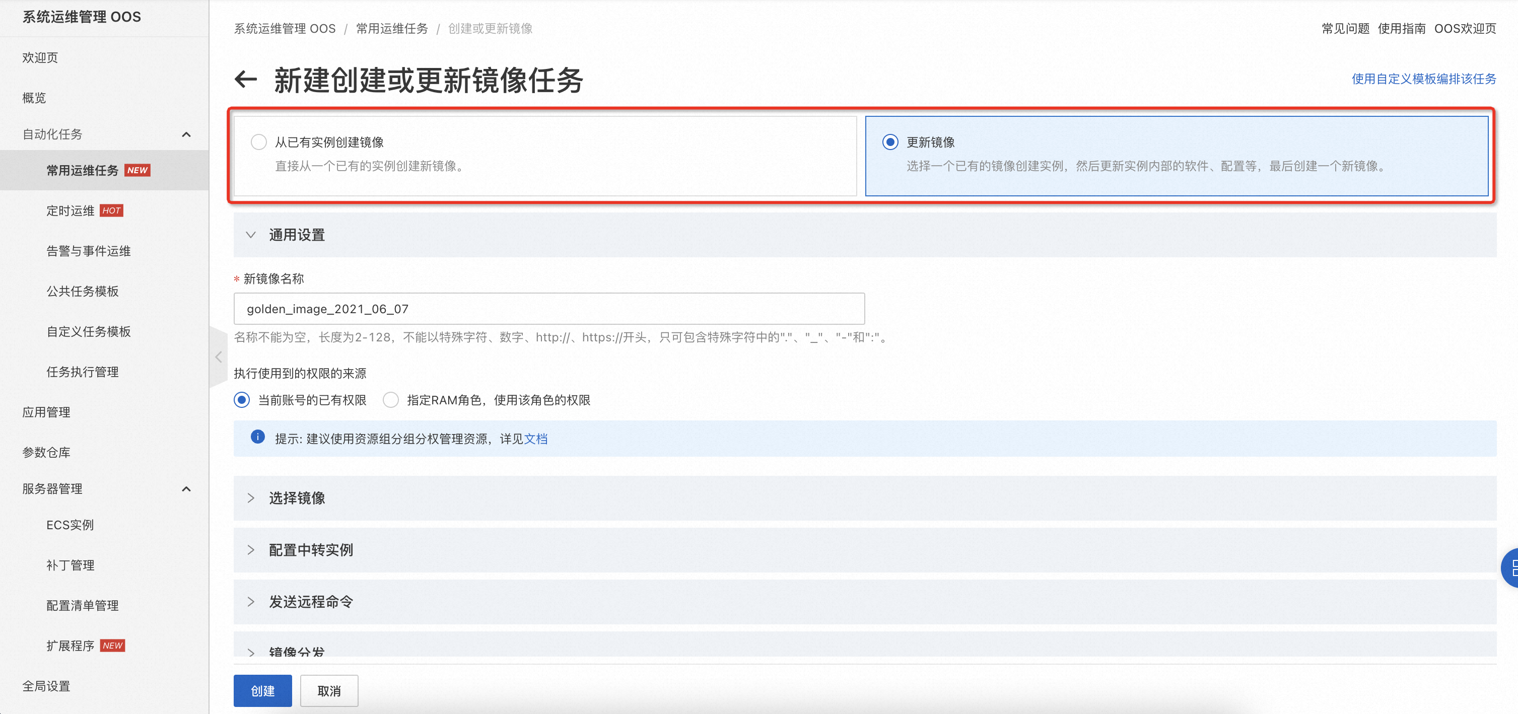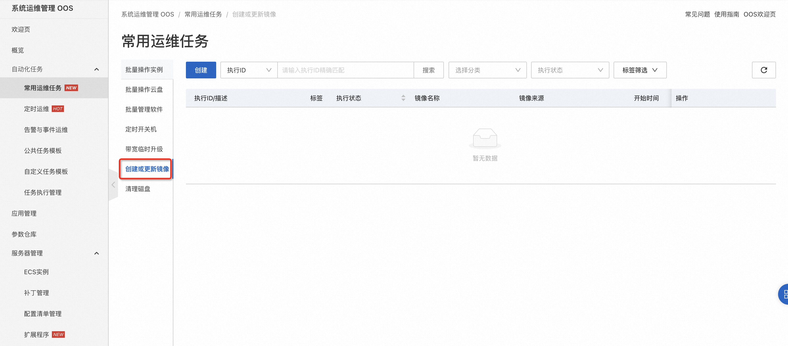 - 登入共享服务账号,进入系统运维管理 OOS 控制台,切换到镜像管理地域,在左侧导航栏选择自动化任务 > 自定义任务模版。