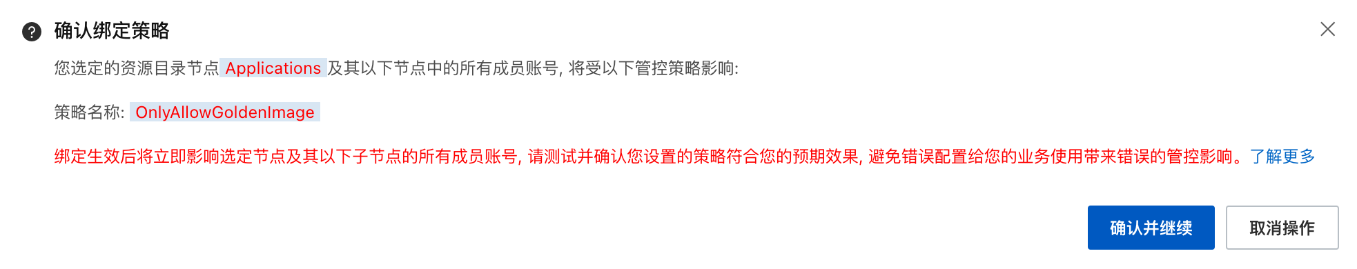 通过使用管控策略(Control Policy),限制 Application 目录下的业务成员账号,均只能使用特定 ImageId 的 Golden Image 创建 ECS,确保操作系统基线安全。但有部分例外情况,请参考注意事项章节中管控策略限制一节。