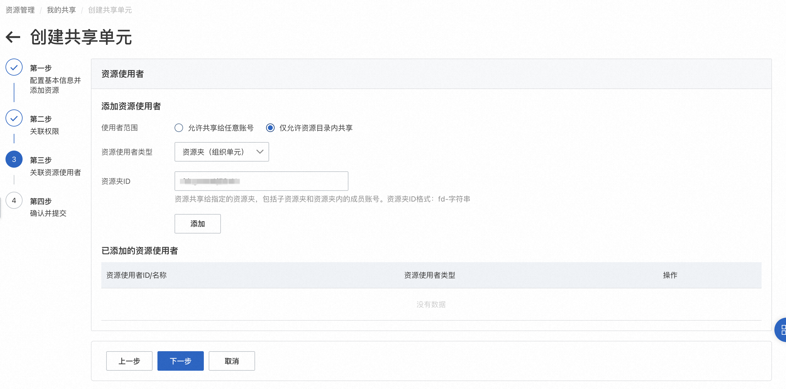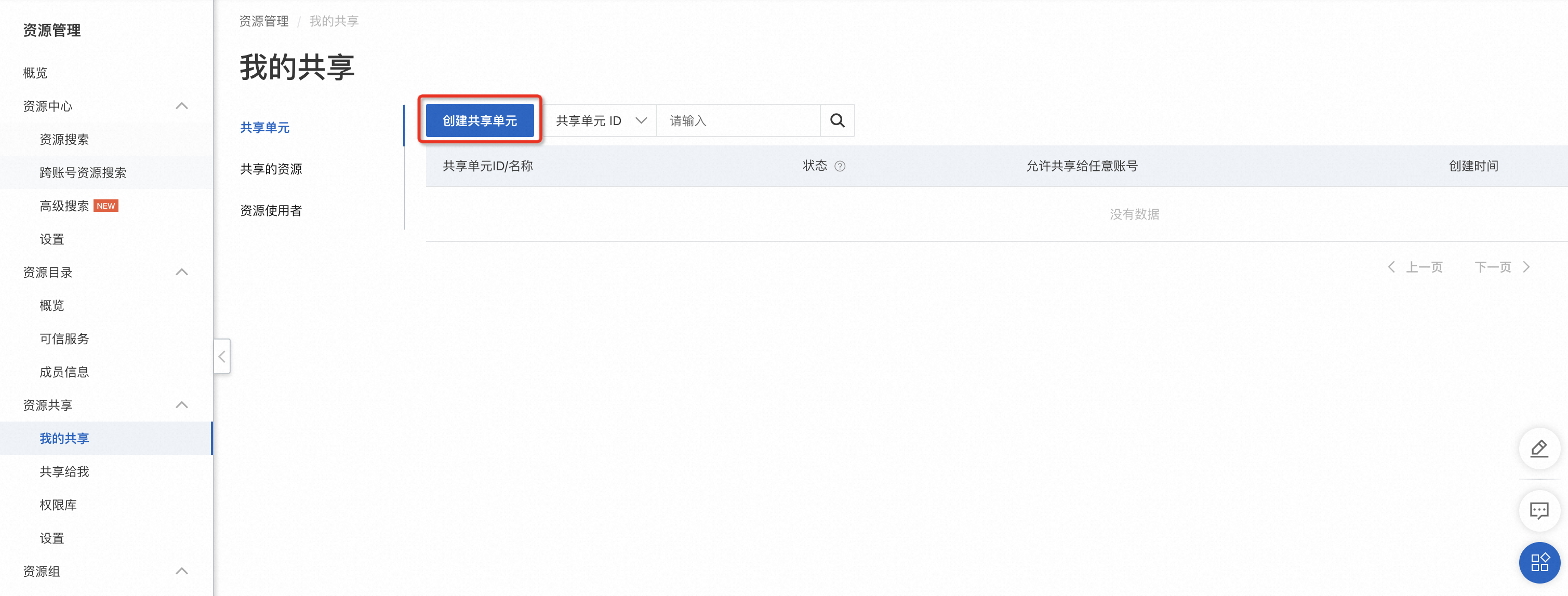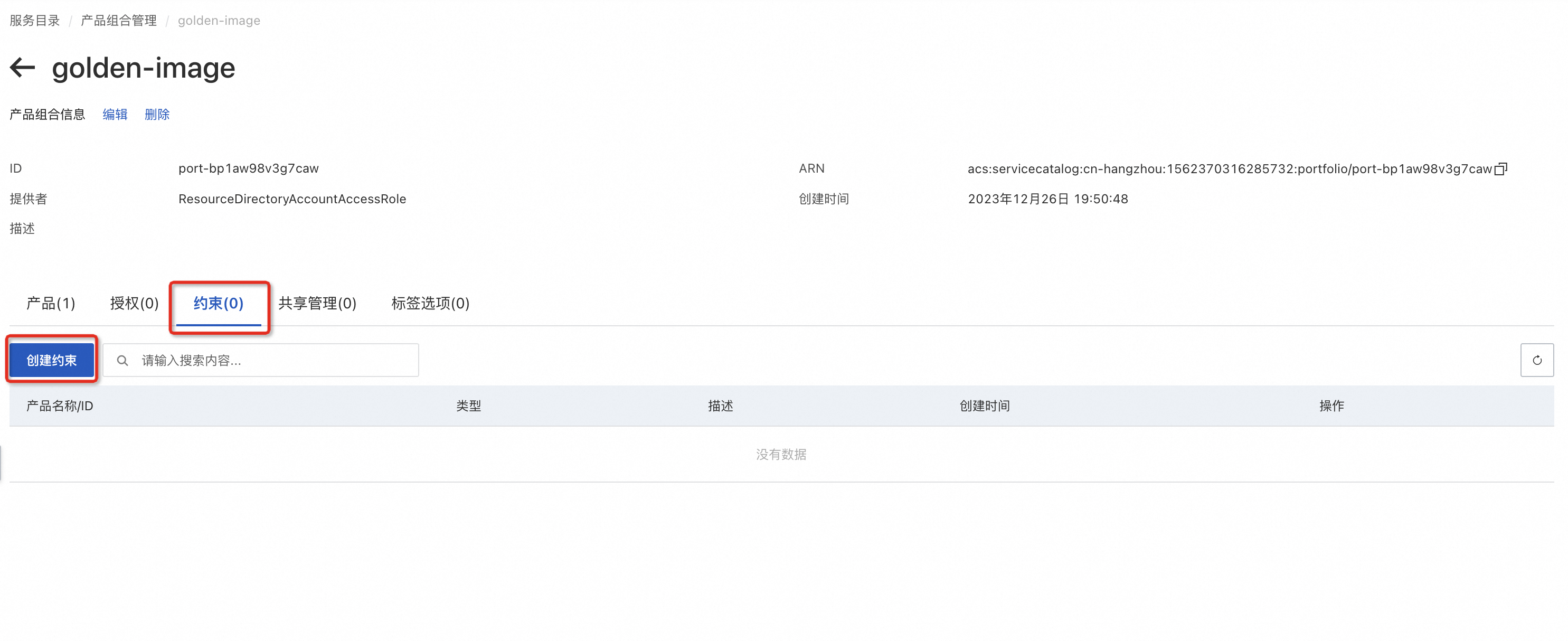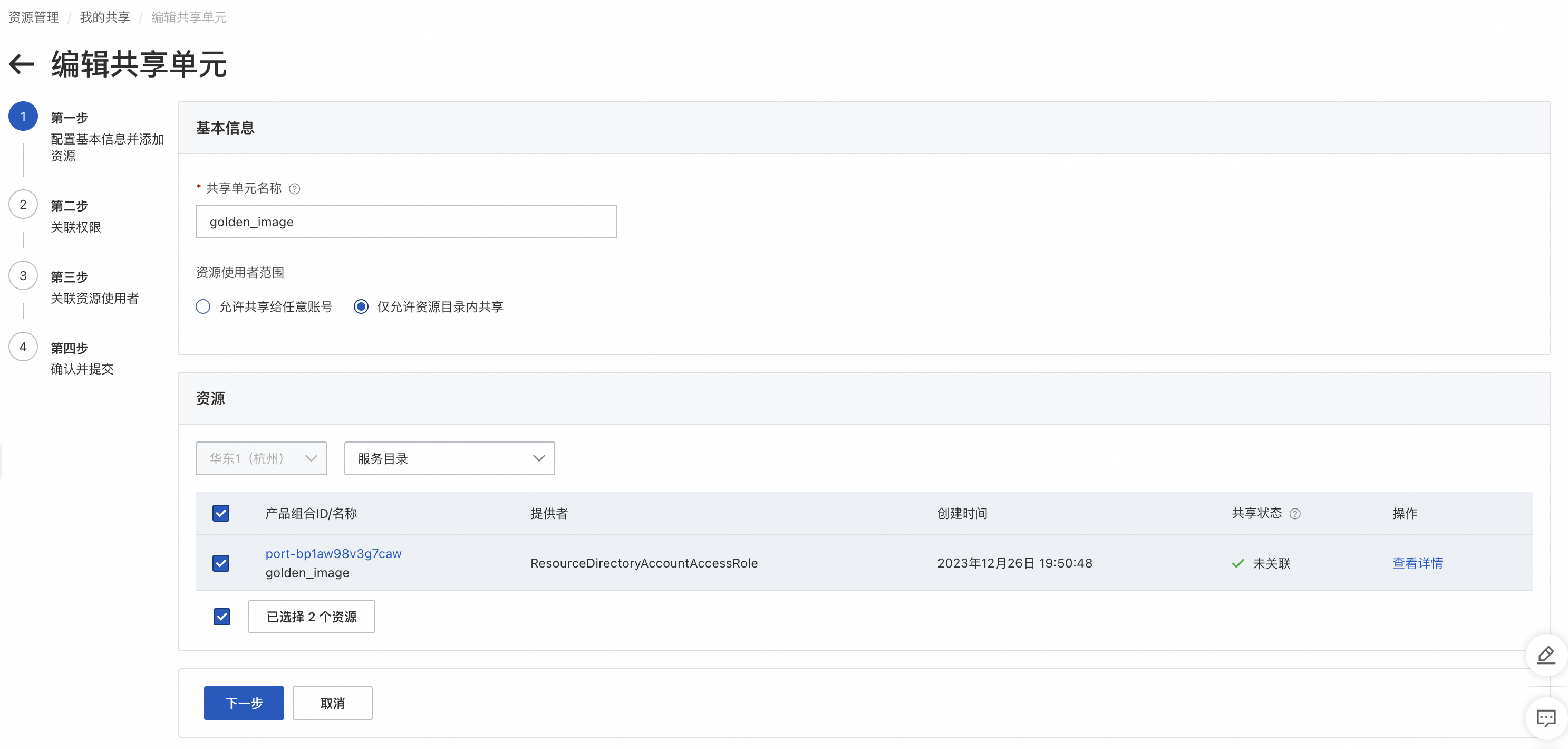。具体操作,请参考创建模板约束。 - 参考实施步骤 > 操作步骤 > 分发镜像 > 跨账号共享镜像章节,通过共享单元将上述创建的产品组合共享给目标账号或资源夹。这里以跨账号共享镜像章节中创建的共享单元为例。进入资源共享 > 我的共享,找到该共享单元,进入共享单元详情,单击编辑共享单元。在编辑页面资源一栏,新增在步骤 1 中已经创建的服务目录产品组合。