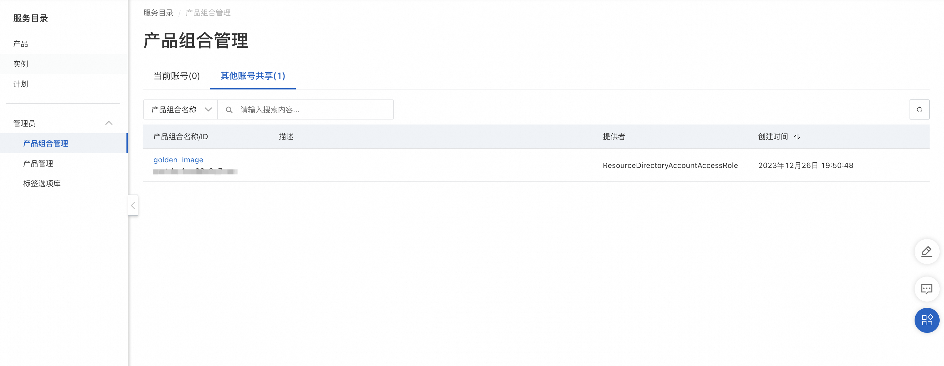 - 使用服务目录管理员身份(详情请参考为管理员授权),登入被共享的其他成员账号,进入服务目录控制台,在左侧导航栏选择管理员 > 产品组合管理。选择其他账号共享标签页,找到在步骤 7 中共享的产品组合。