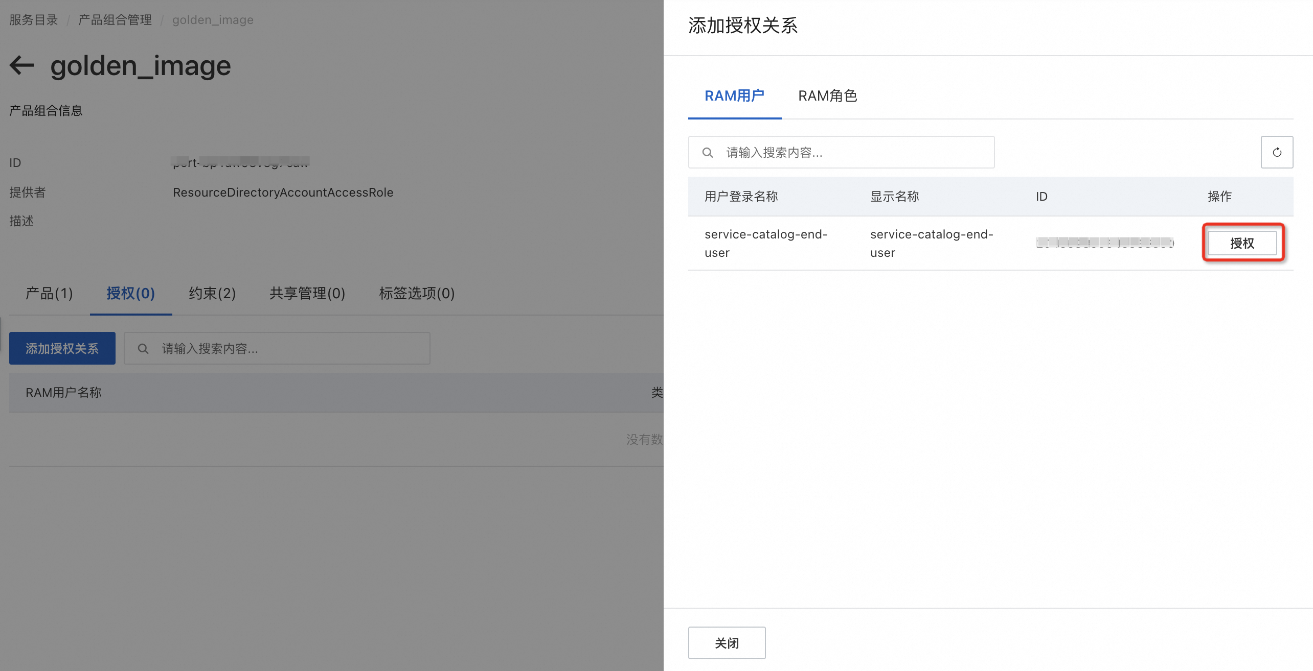 - 进入该产品组合详情页,选择授权标签页,单击添加授权关系,选择允许使用该产品组合中产品的终端用户,终端用户可以为 RAM 用户或者 RAM 角色。请赋予该 RAM 用户或者 RAM 角色AliyunServiceCatalogEndUserFullAccess 的系统策略。单击授权