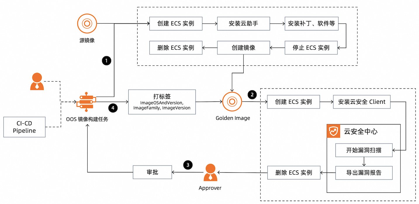 镜像构建过程中,您可以接入镜像漏洞扫描(图中3)和人工审批流程(图中4),进一步保证镜像的安全合规。详情请参考自动化方案章节。