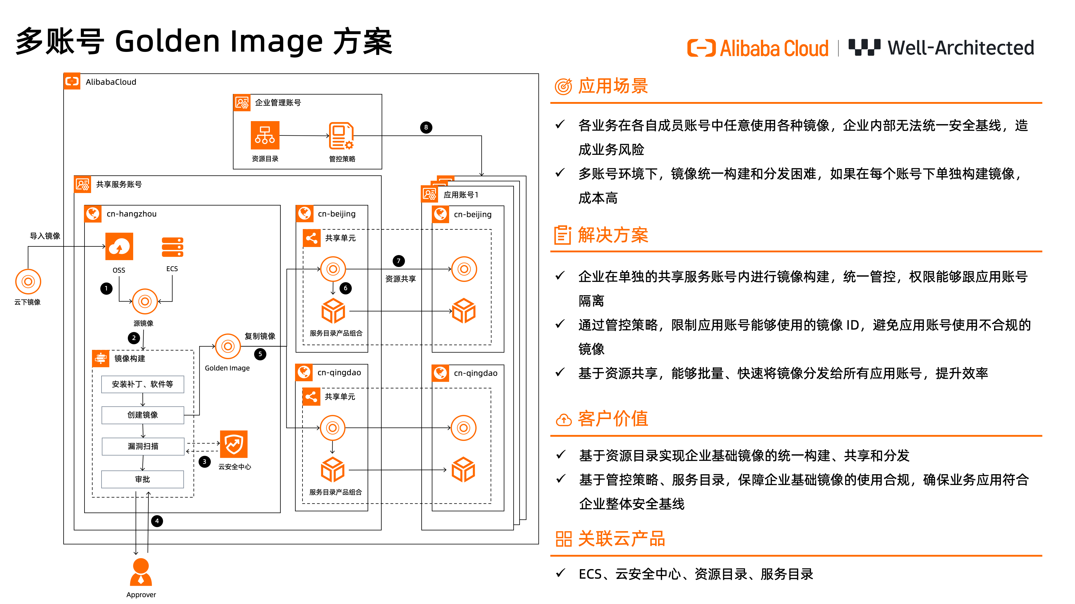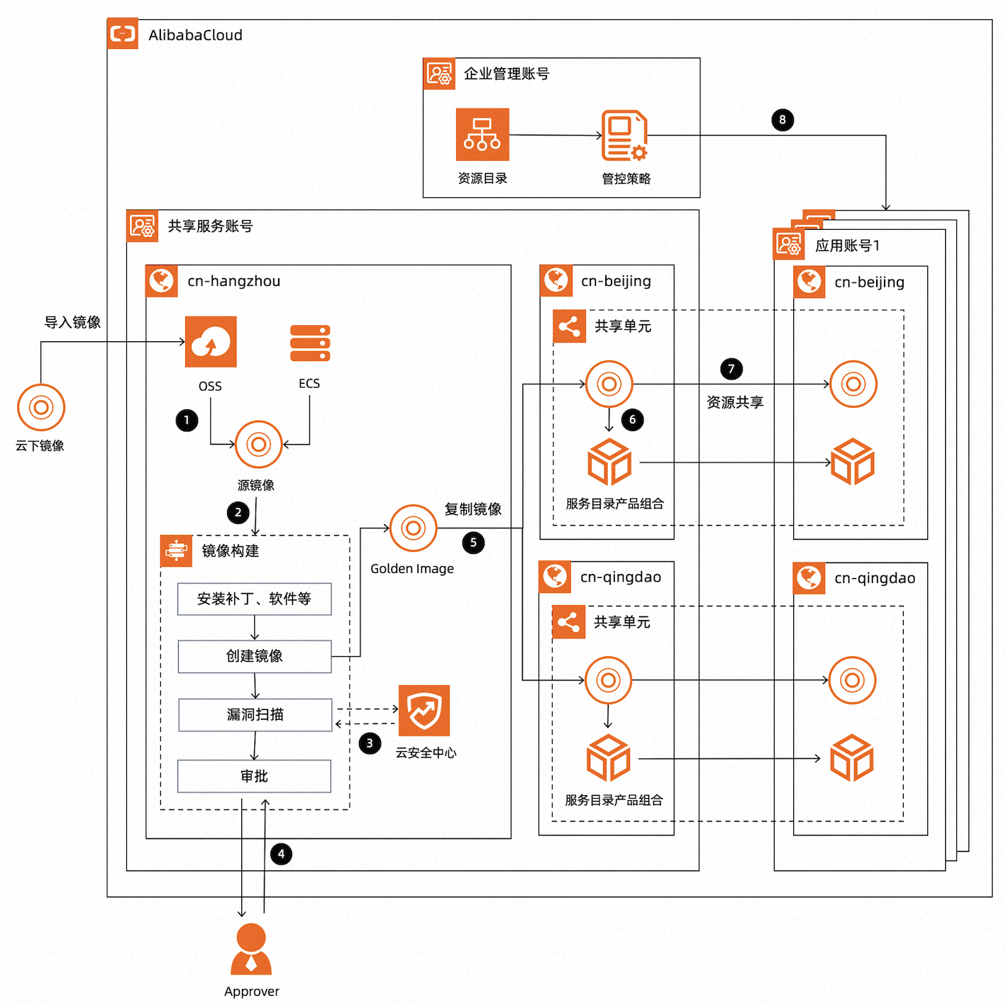 本方案基于多账号体系实现企业 Golden Image 的构建和分发。镜像构建在共享服务账号内进行,您可以将已有的云下镜像导入到阿里云(图中1),当需要构建新的镜像时,您可以触发系统运维管理服务的自动化任务来进行(图中2),构建过程中,还可以接入镜像漏洞扫描(图中3)和人工审批流程(图中4),进一步保证镜像的安全合规。构建完成后,复制到企业业务所在的所有地域(图中5),然后配置服务目录产品组合(图中6),保证镜像的受控使用。通过资源共享的共享单元,将镜像和服务目录产品组合共享给企业内相应的业务成员账号(图中7)。业务成员账号可以通过服务目录的产品组合一键创建使用 Golden Image 的云服务器 ECS。最后通过下发管控策略(图中8),确保业务成员账号只能使用 Golden Image 创建 ECS。