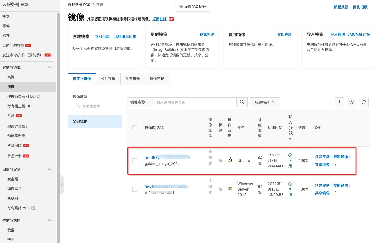 至此,您已成功触发 Golden Image 的构建任务,每次构建 Golden Image 时,请确保同一用途的 Golden Image,配置相同的镜像族系(imageFamily)和镜像OS信息(imageOSAndVersion)。
