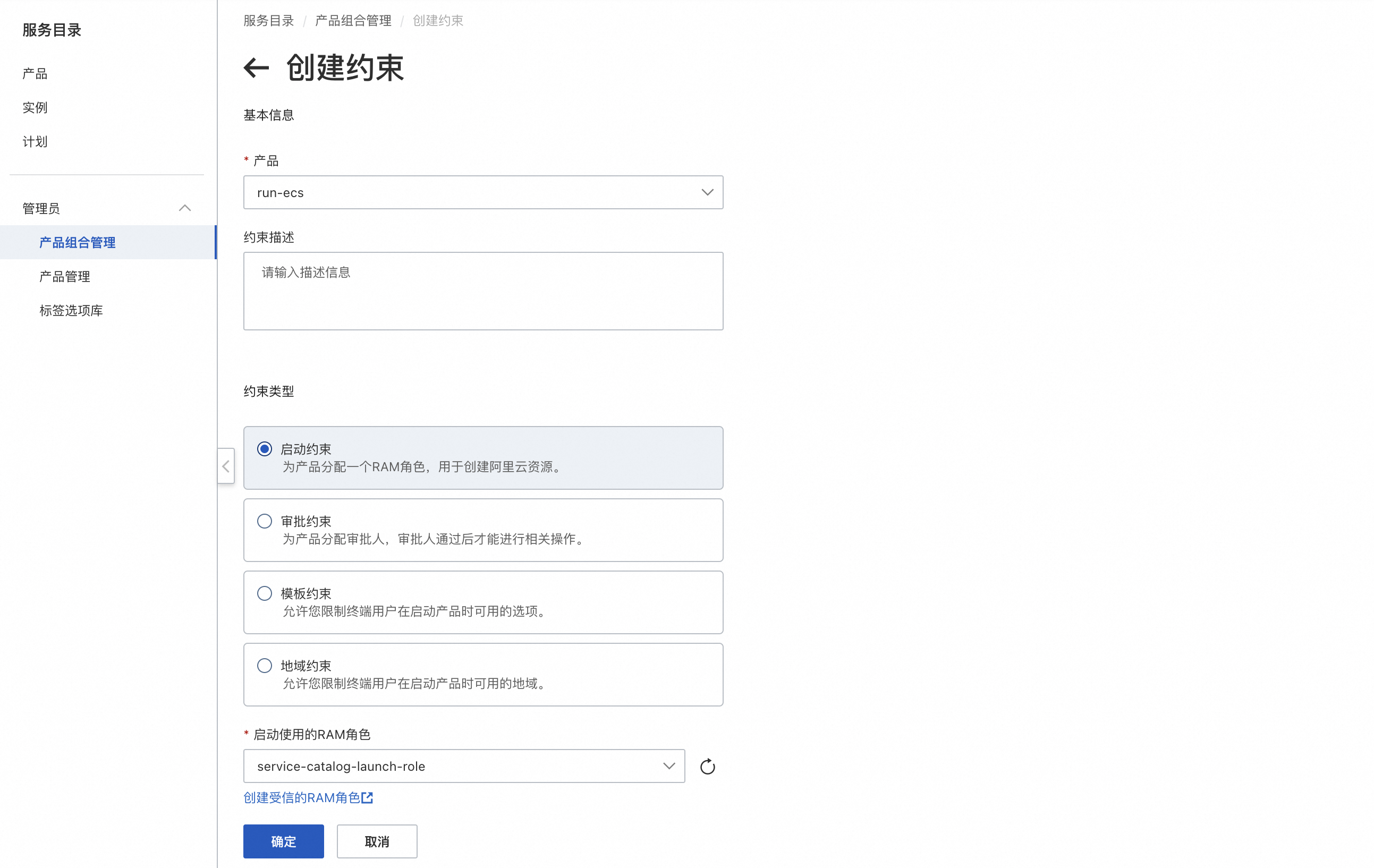 替换为服务目录产品组合的启动约束中配置的 RAM 角色名称。在本例中,该 RAM 角色名称为 service-catalog-launch-role。