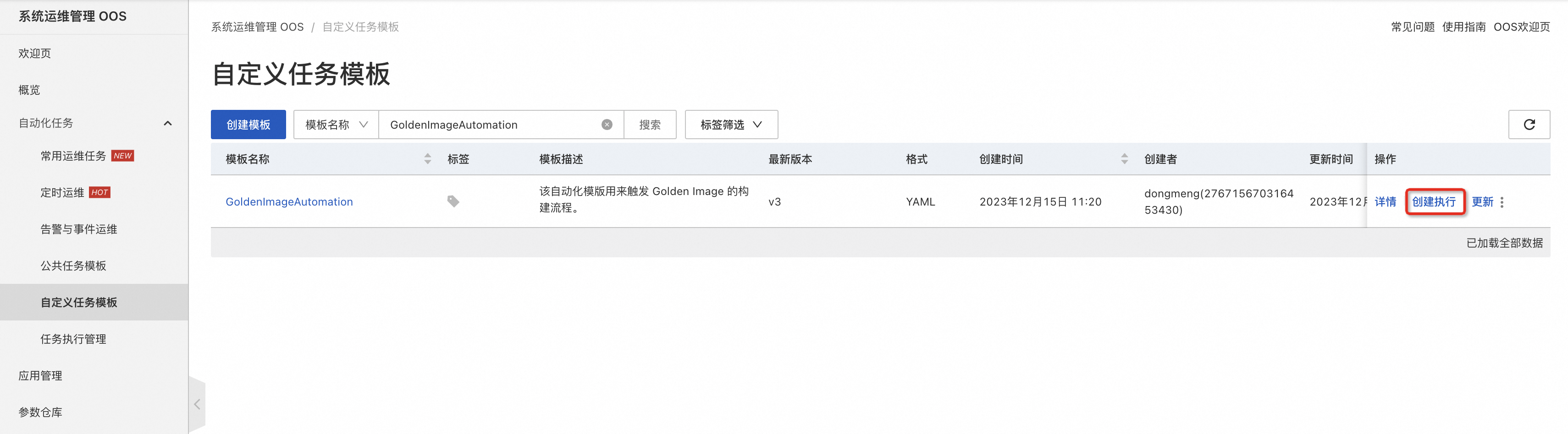 - 在任务模版列表中,选择 GoldenImageAutomation,单击创建执行。