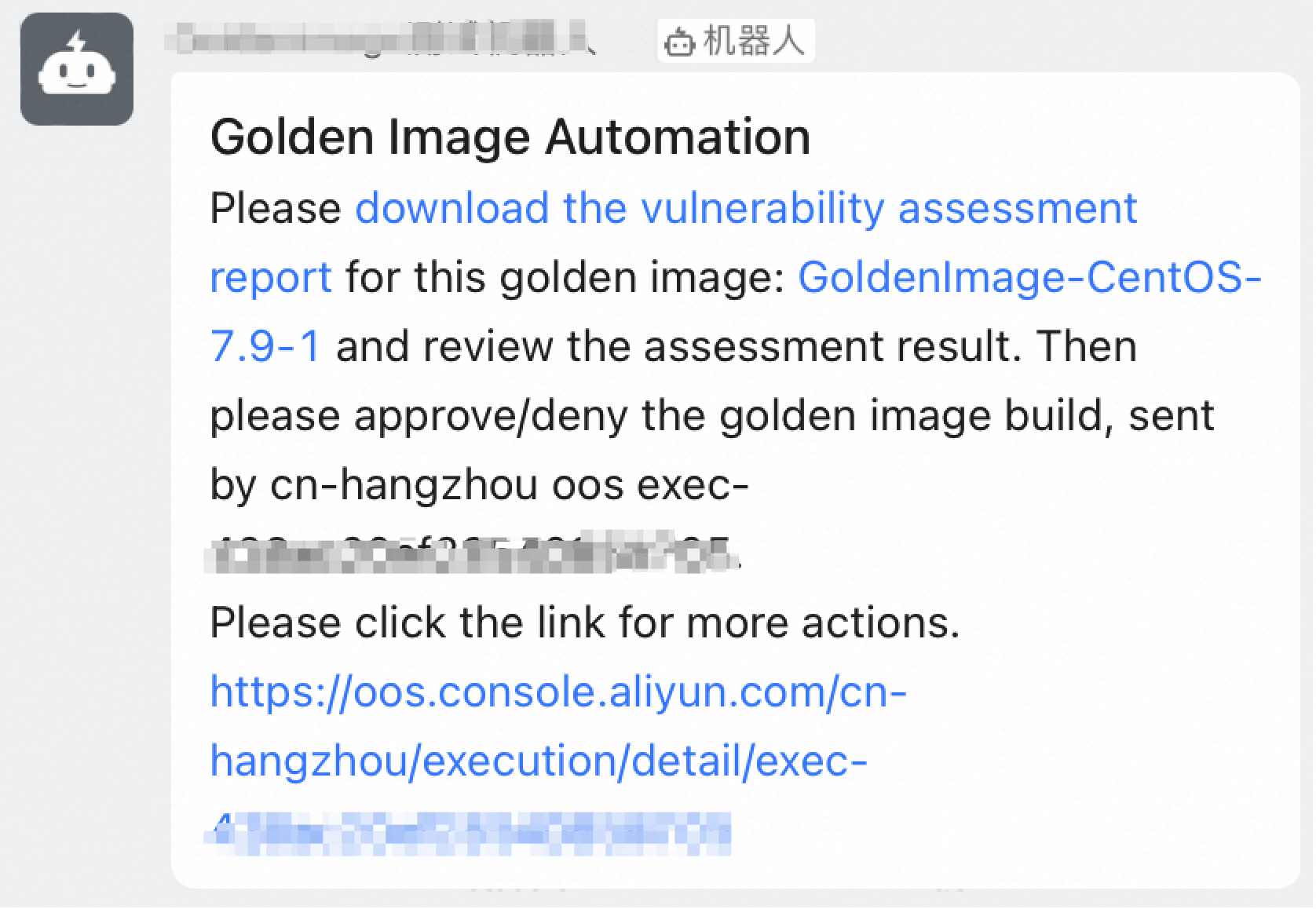 - 漏洞扫描完成后,会将漏洞报告以及审批信息通过 WebHook 进行消息通知。以钉钉机器人为例,您会收到如下的一条消息通知。