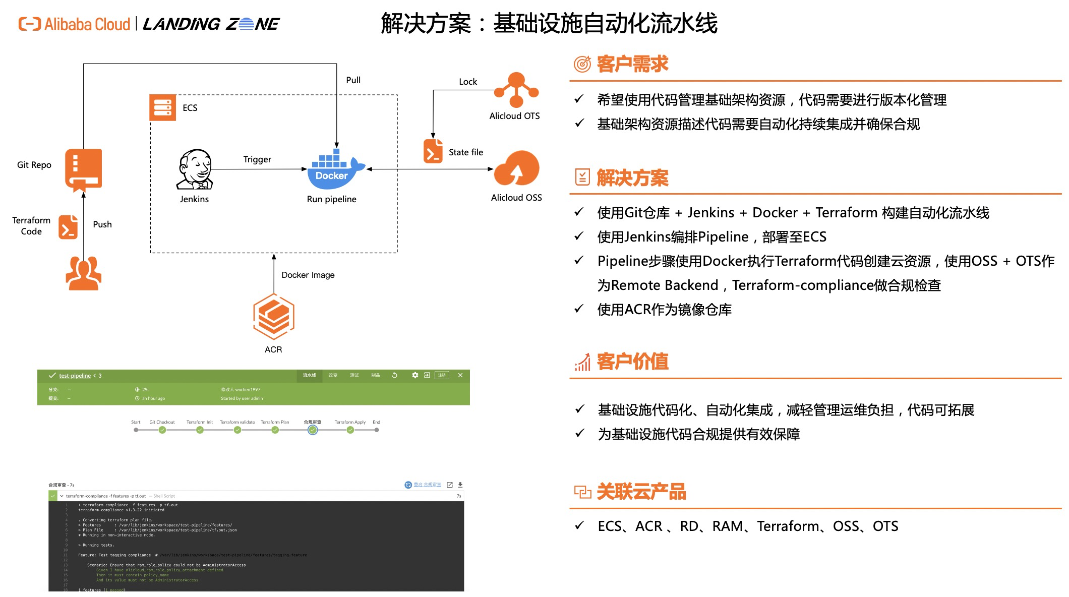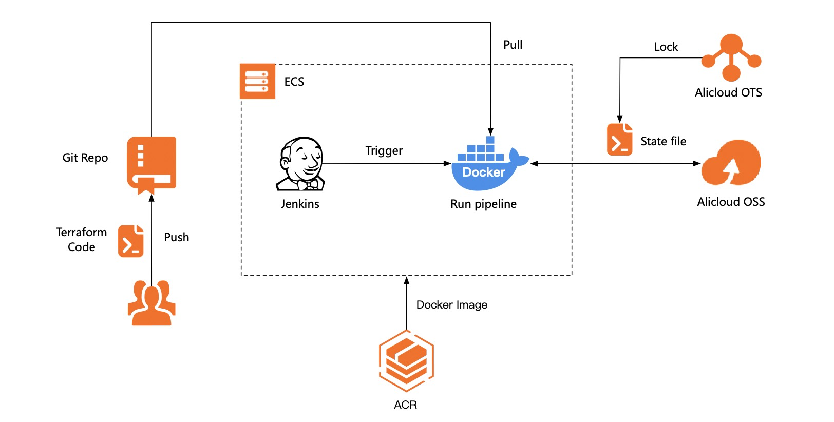 本方案主要目的是指导企业客户搭建一套管理Terraform代码变更的流水线。使用Git仓库管理Terraform代码,使用Jenkins进行CI/CD集成,使用Terraform-compliance插件进行合规审计,使用OSS + OTS作为Remote Backend实现多人协作及State文件安全。