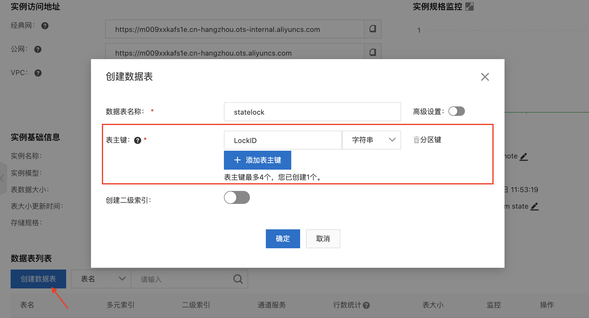 - 创建完成后进入OTS实例,在实例中创建数据表。注意:数据表中必须含有一个名为LockID,字符串类型的主键。