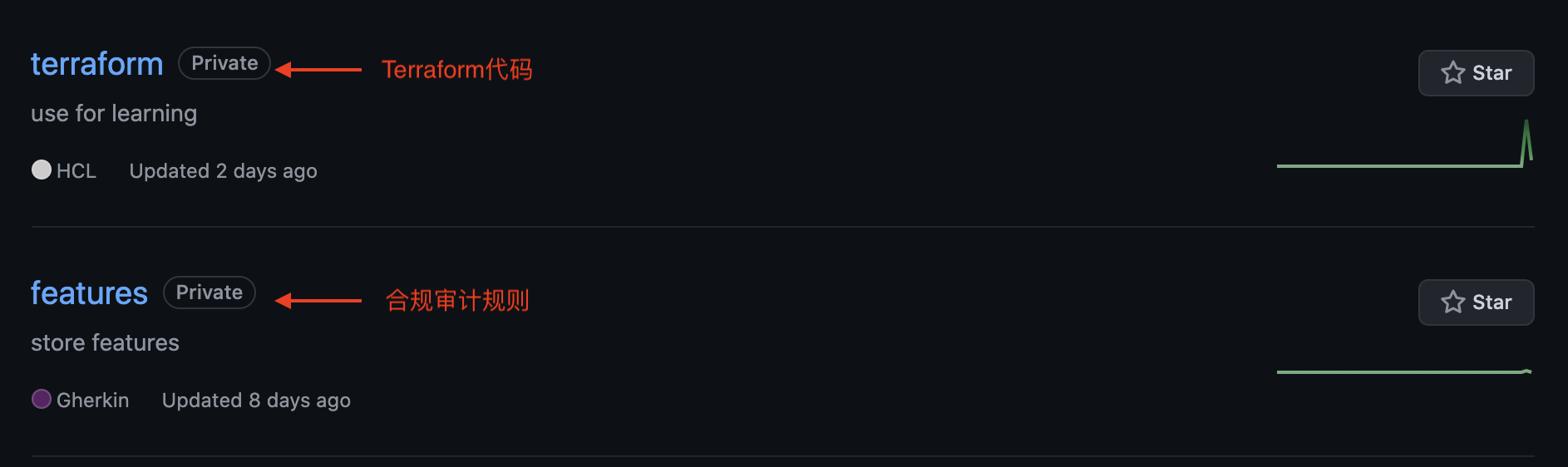 - 规则编写完成后,可以将规则上传到Git仓库。建议Terraform代码和合规规则使用不同的Git仓库存储,分别由开发人员和审计人员管理。