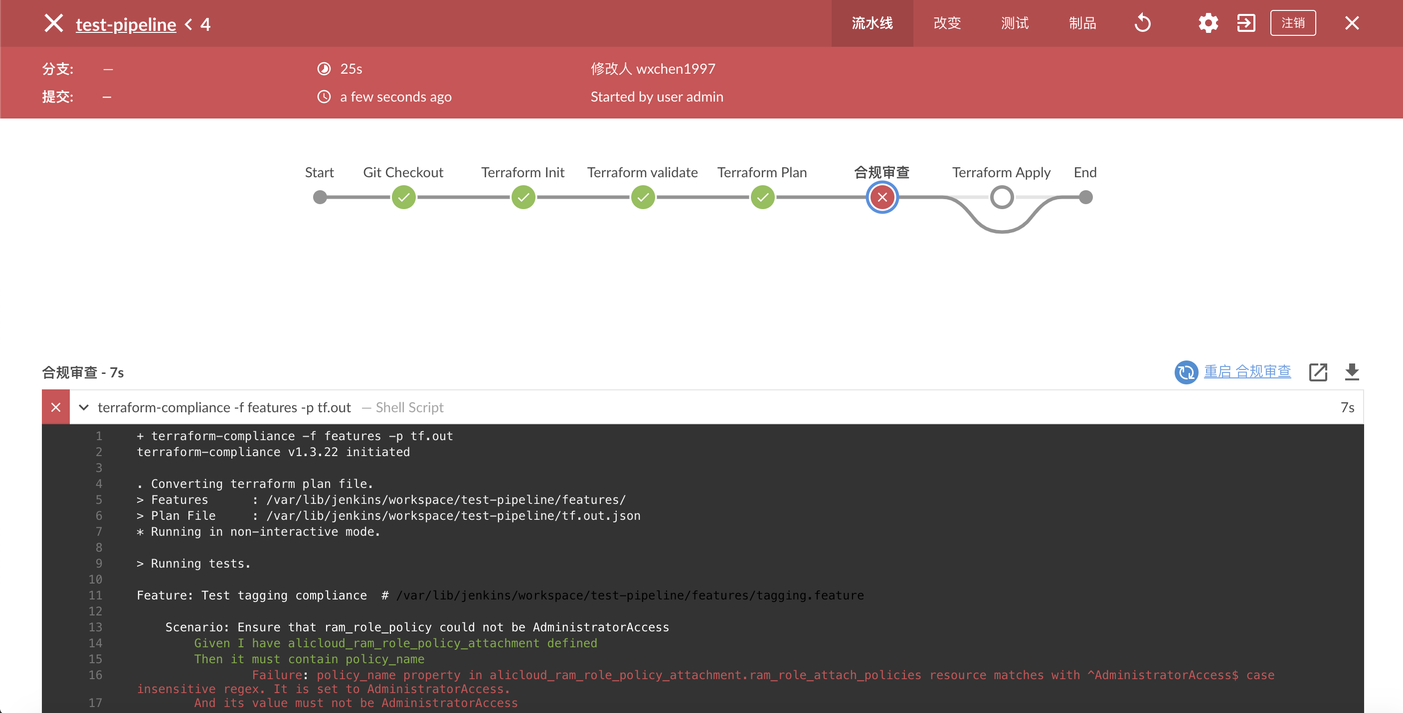 - 当我们将RAM用户的权限修改为“AdministratorAccess”时,重新将Terraform代码push到Git仓库,再次执行该流水线,会发现合规审查无法通过。