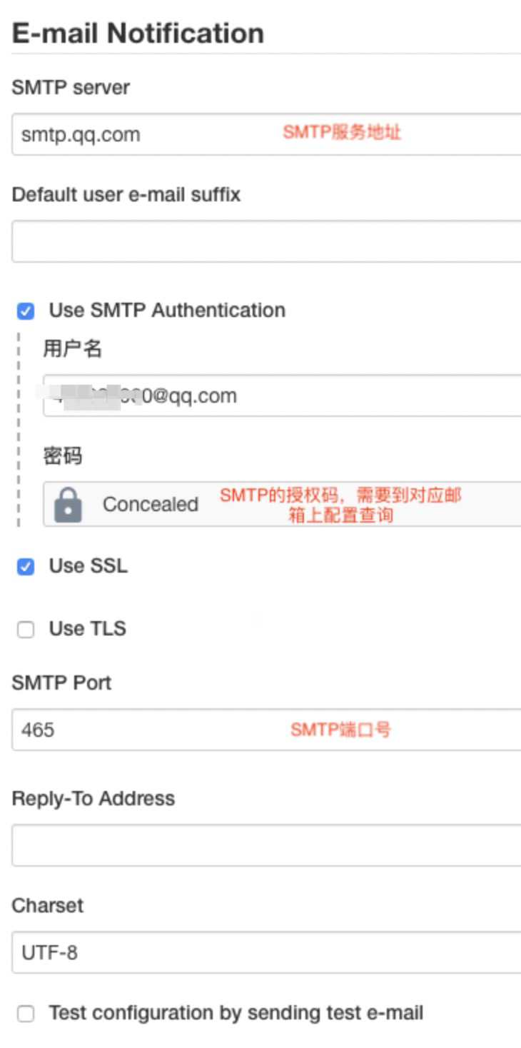 - 填写“E-mail Notification”下的参数,该参数与所使用的邮箱有关。以QQ邮箱为例,配置如下图所示: