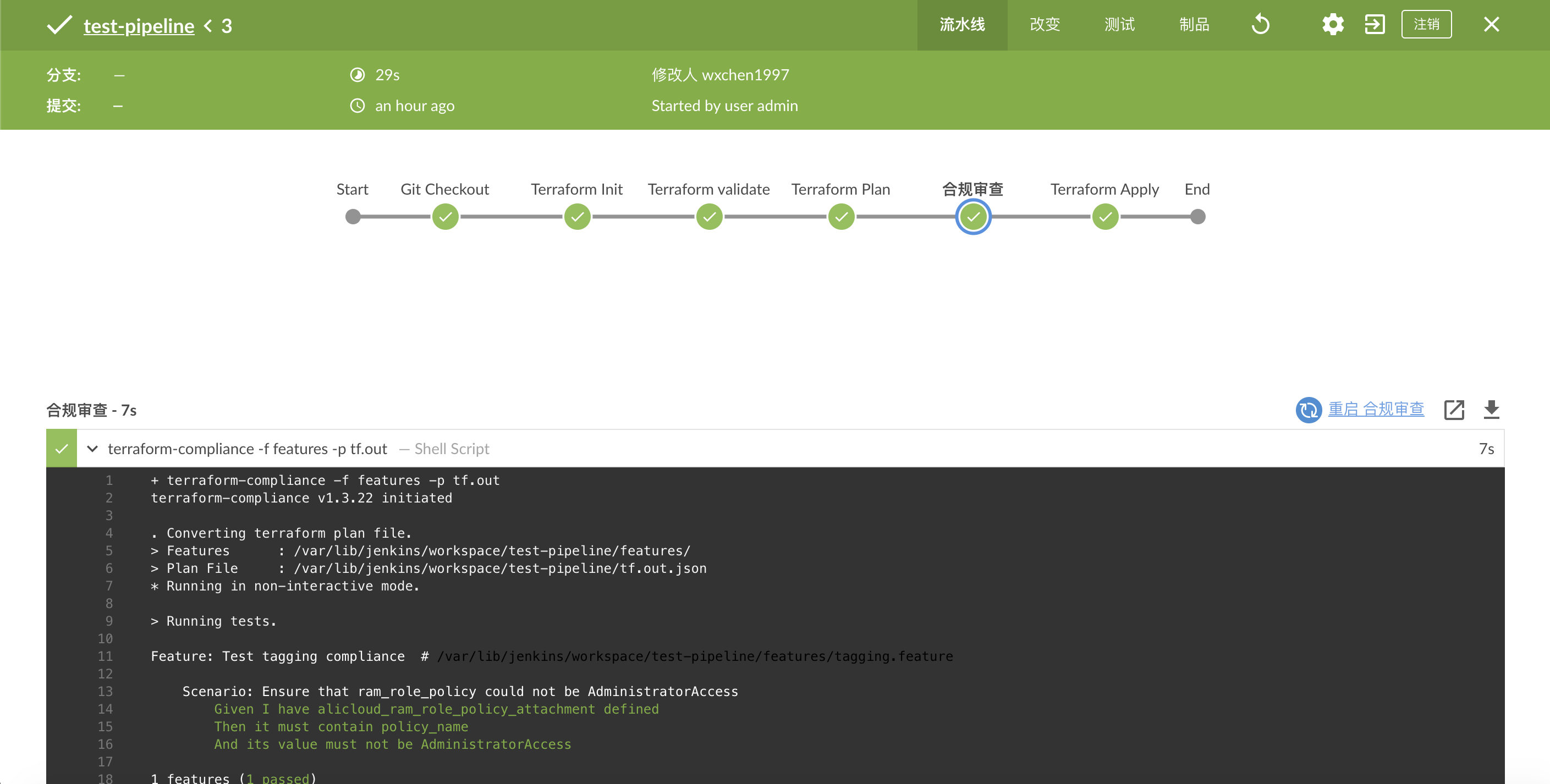 - 至此,我们完成一个简易的Terraform流水线,用户可根据自身需求,修改Terraform代码、合规规则以及流水线的步骤。