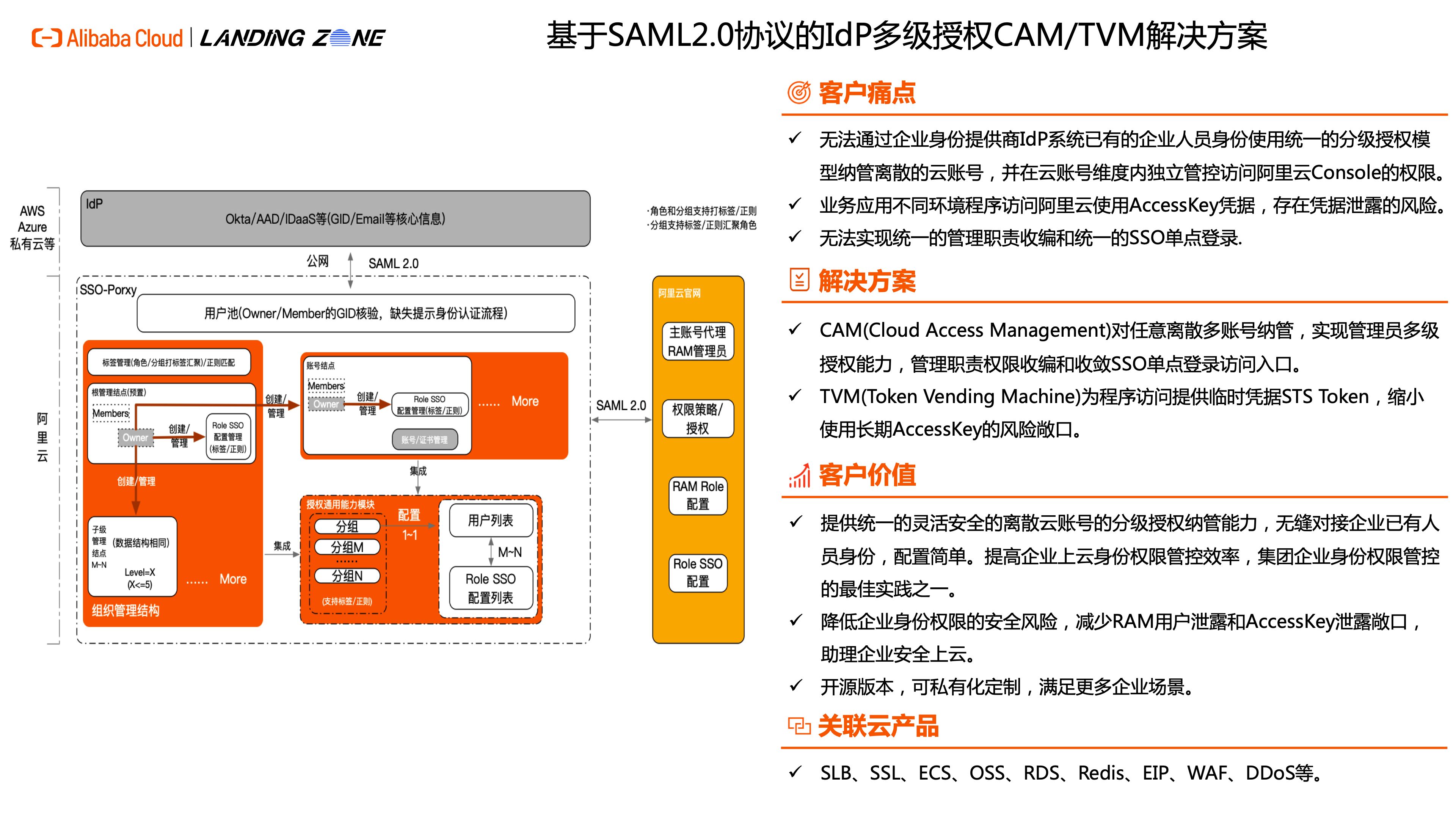 本方案介绍了一种基于SAML2.0协议的IdP(企业身份提供商)多级授权管控方案,包括Cloud Access Management和Token Vending Machine两部分。帮助企业在规划验证,迁移上云的过程中更安全,更高效地统一管理身份权限。