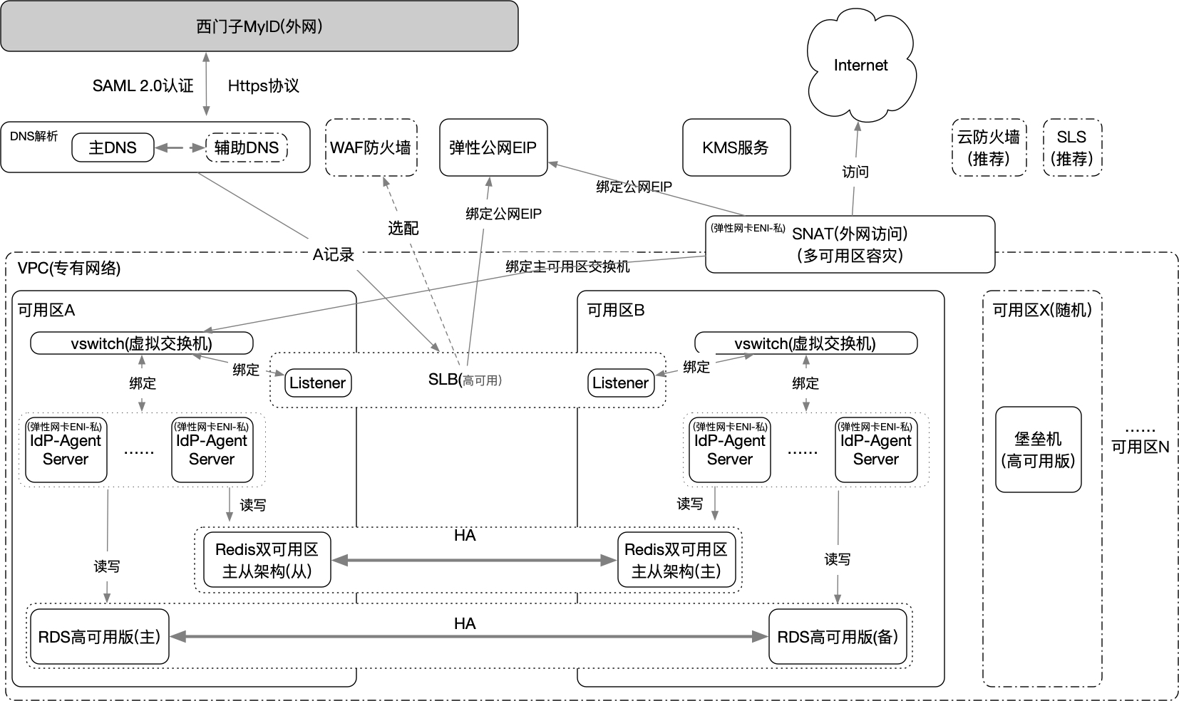 3.接入层使用私网SLB服务+弹性公网EIP组合,高扩展性,双可用区负载横向扩容容灾,可选配WAF防火墙,附带安全组策略,根据实际需要配置看是否限定访问策略;