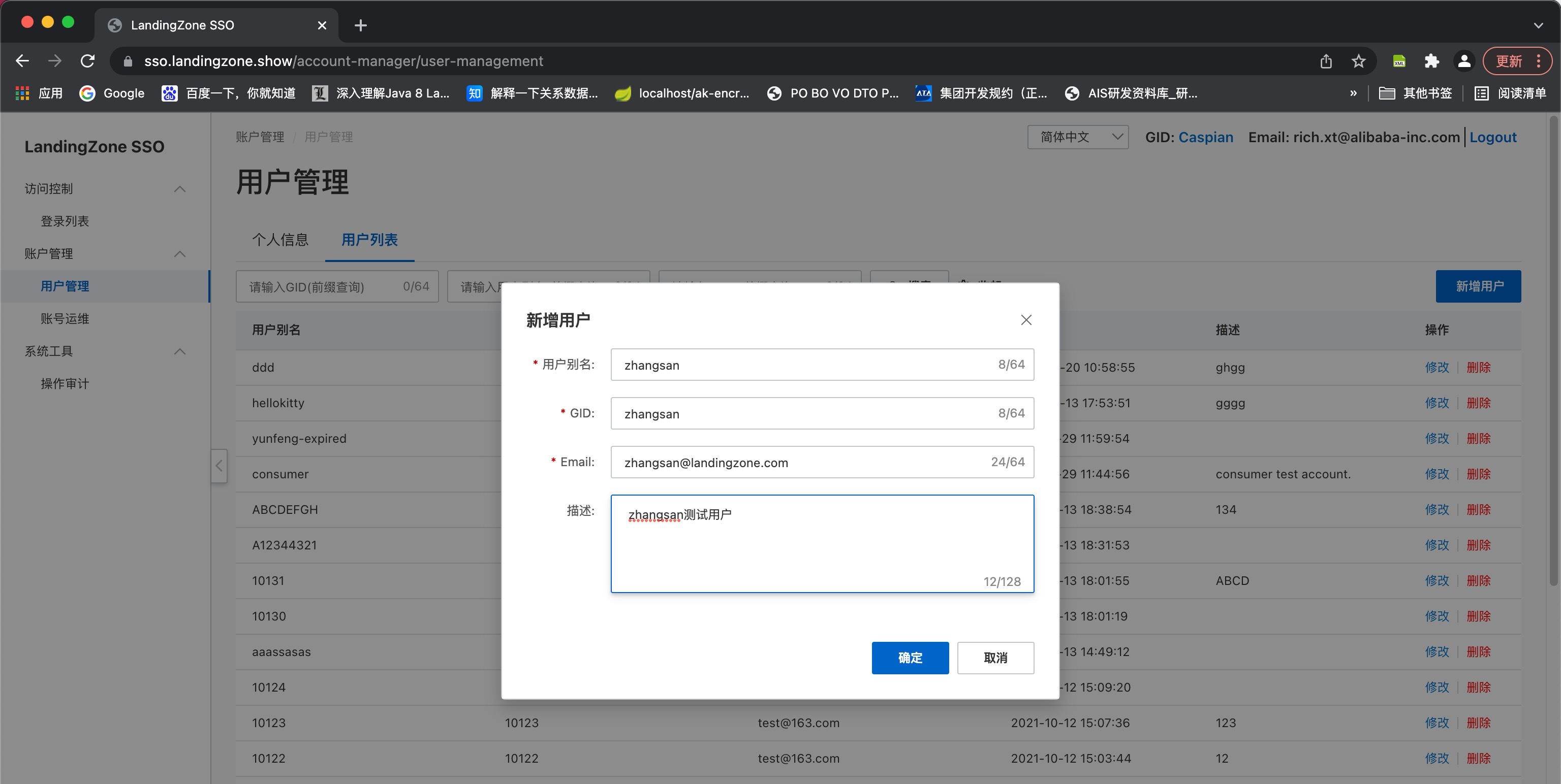 Owner和超管可以创建用户。需要填写用户别名、GID、邮箱、描述信息,系统验证GID和用户别名,不允许重复。