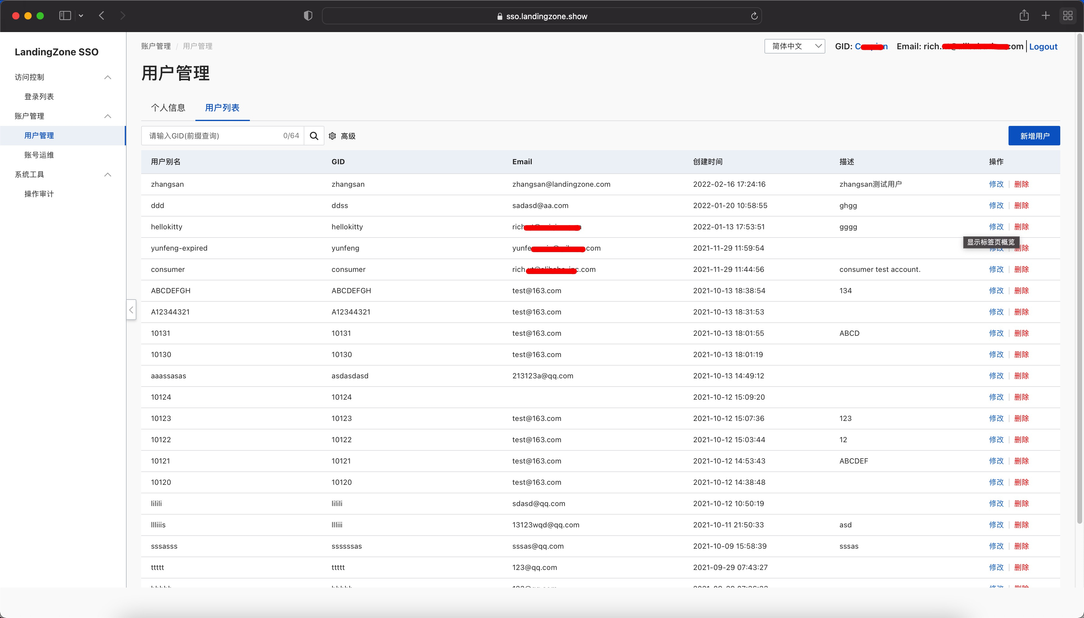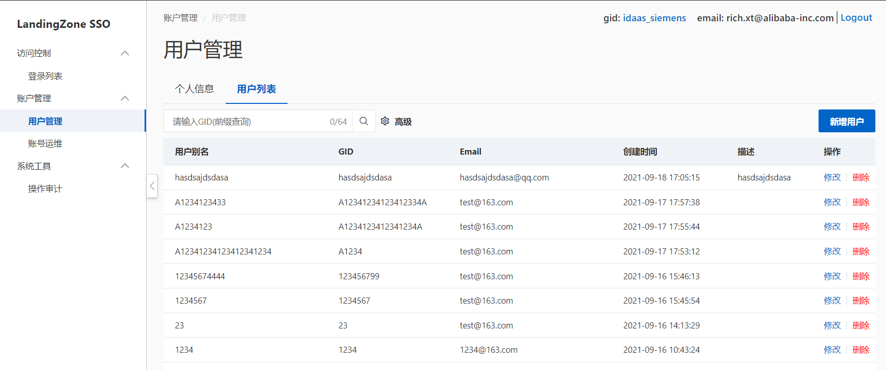Owner和超管可以修改用户别名、邮箱、描述信息,GID作为唯一标识创建后不可修改。系统验证用户别名,不允许重复。