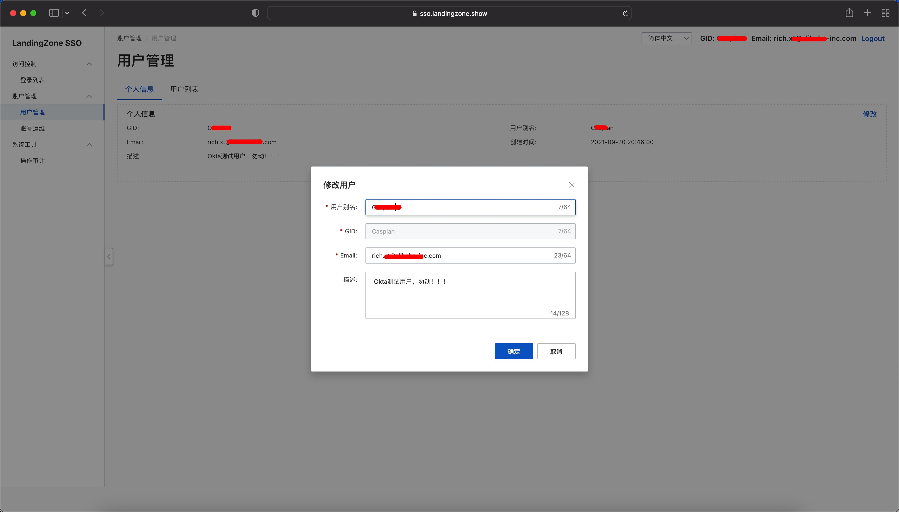 用户本人可以根据需要修改用户个人信息。可以修改用户别名、邮箱、描述信息,系统验证GID和用户别名,不允许重复。