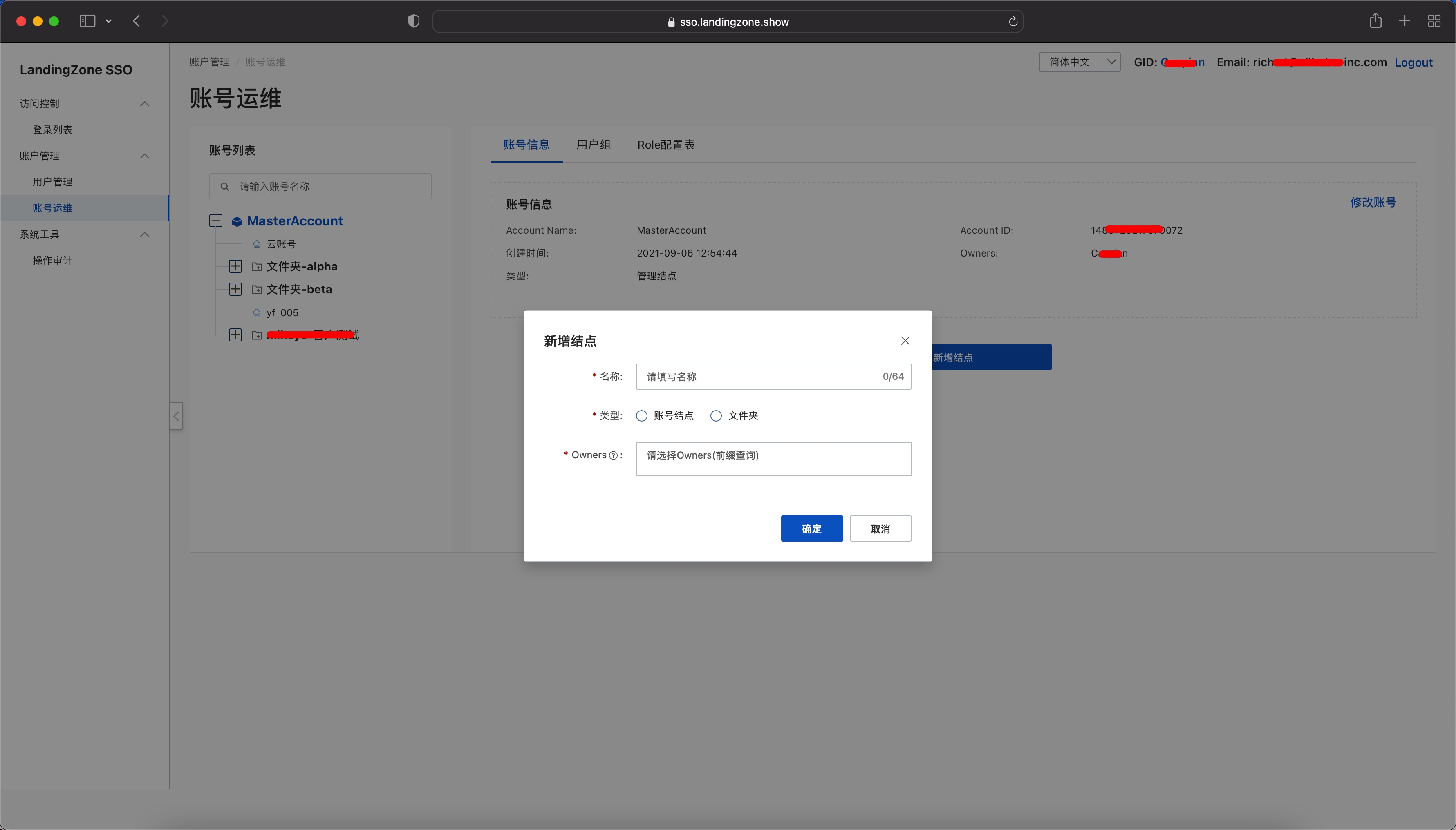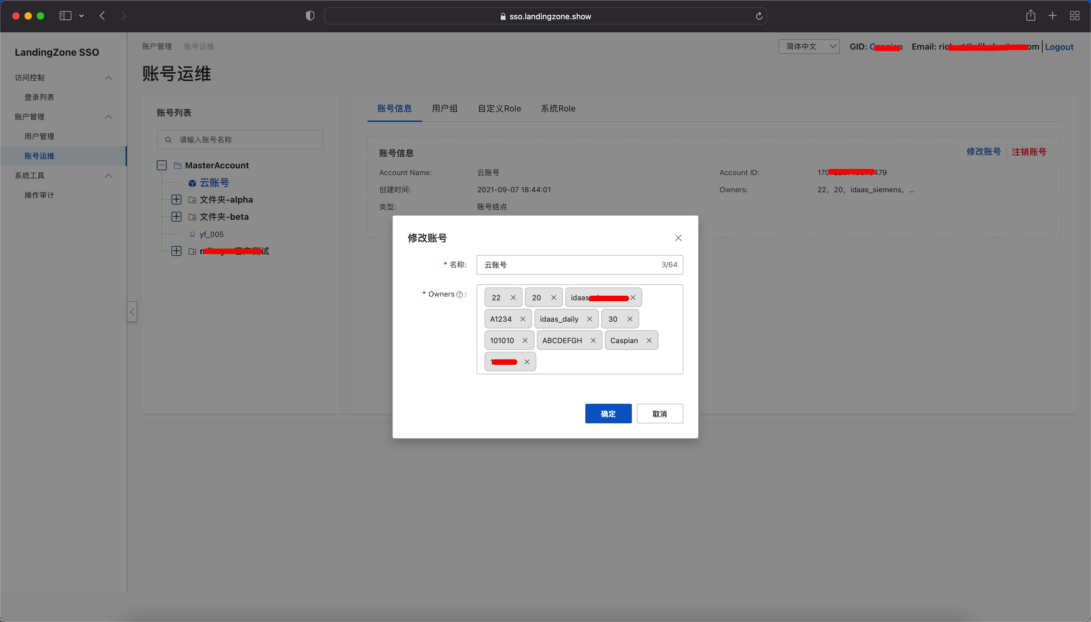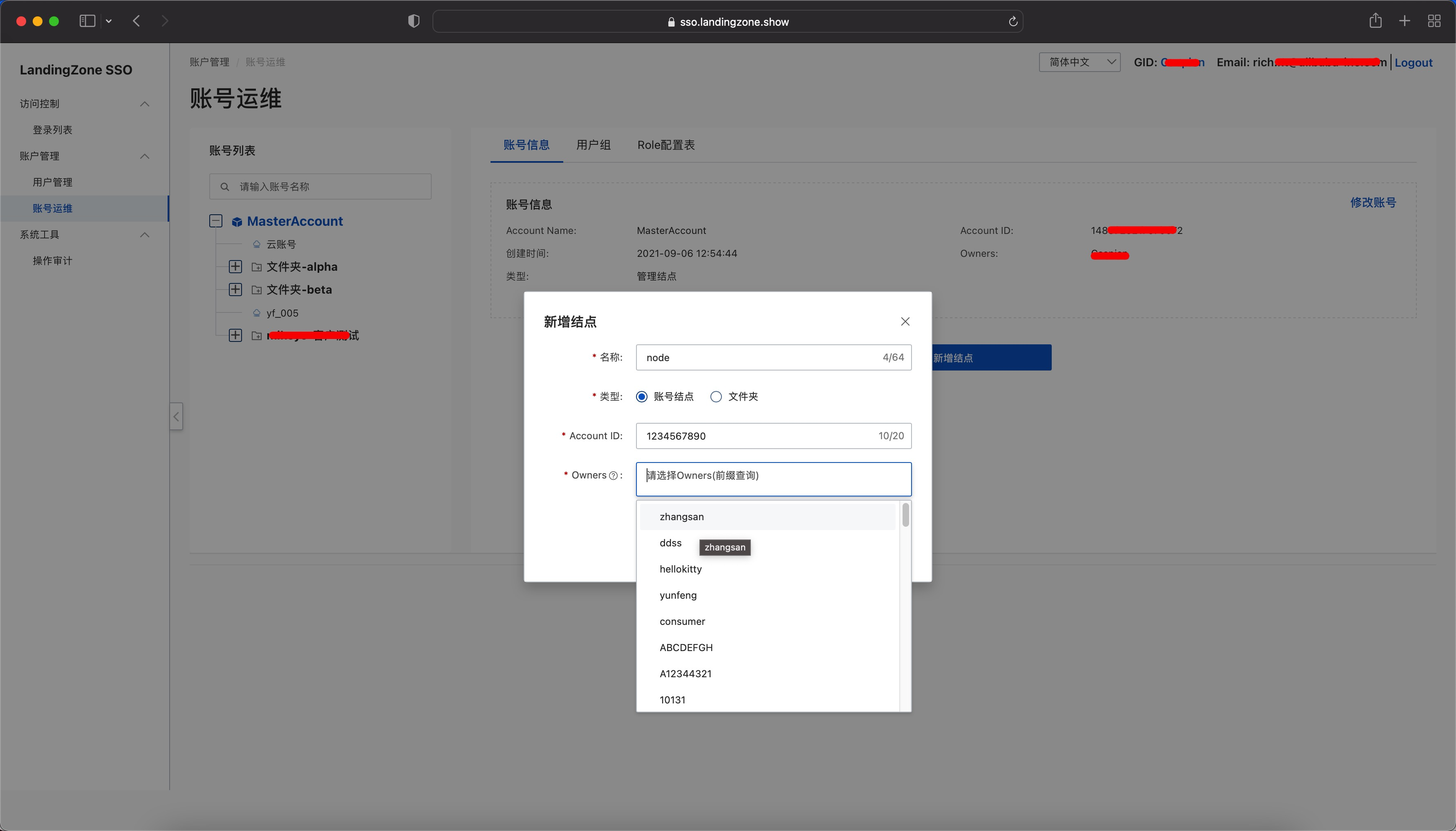 1) 云账号信息维护,对当前云账号结点指派Owner管理员;