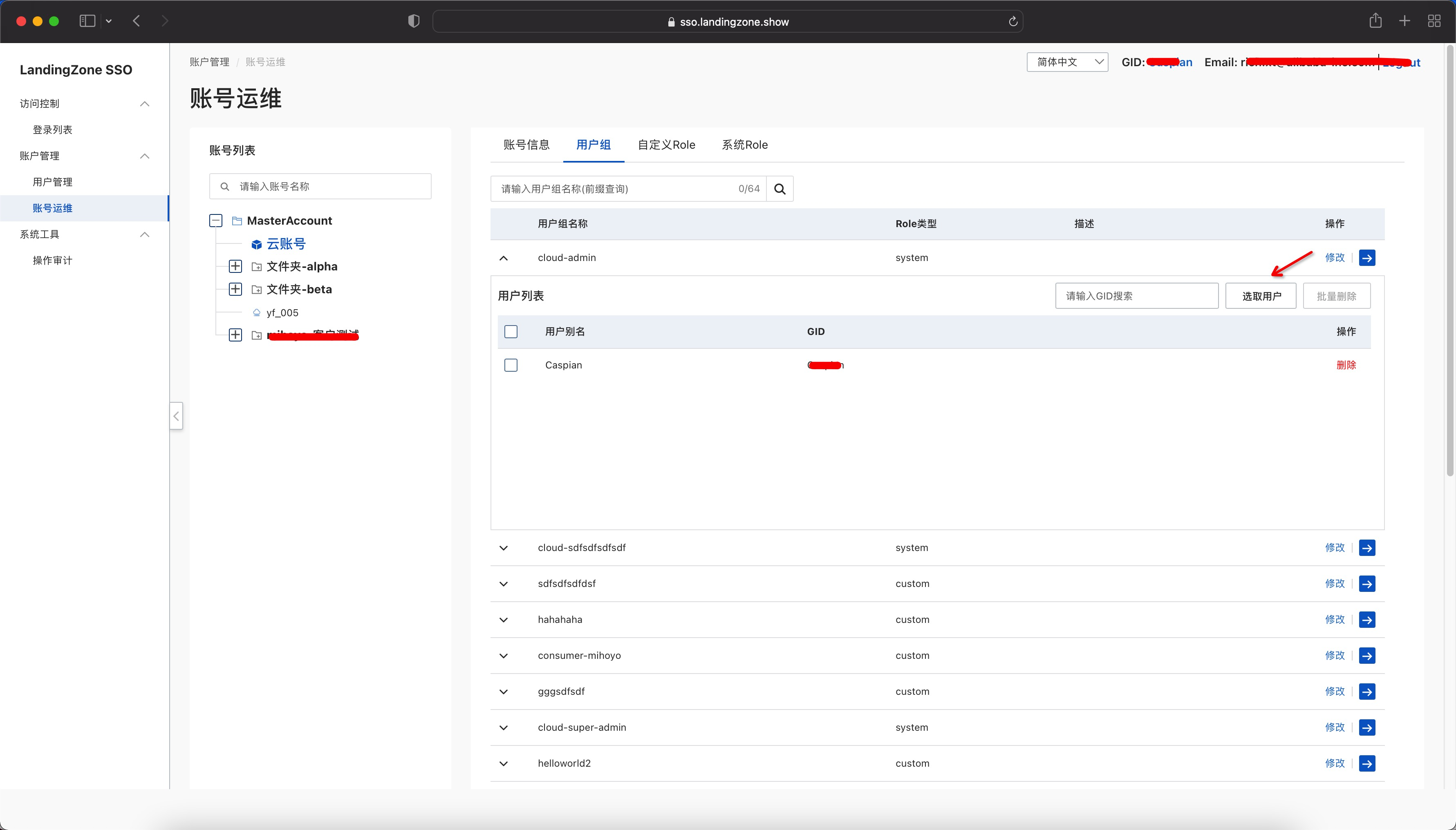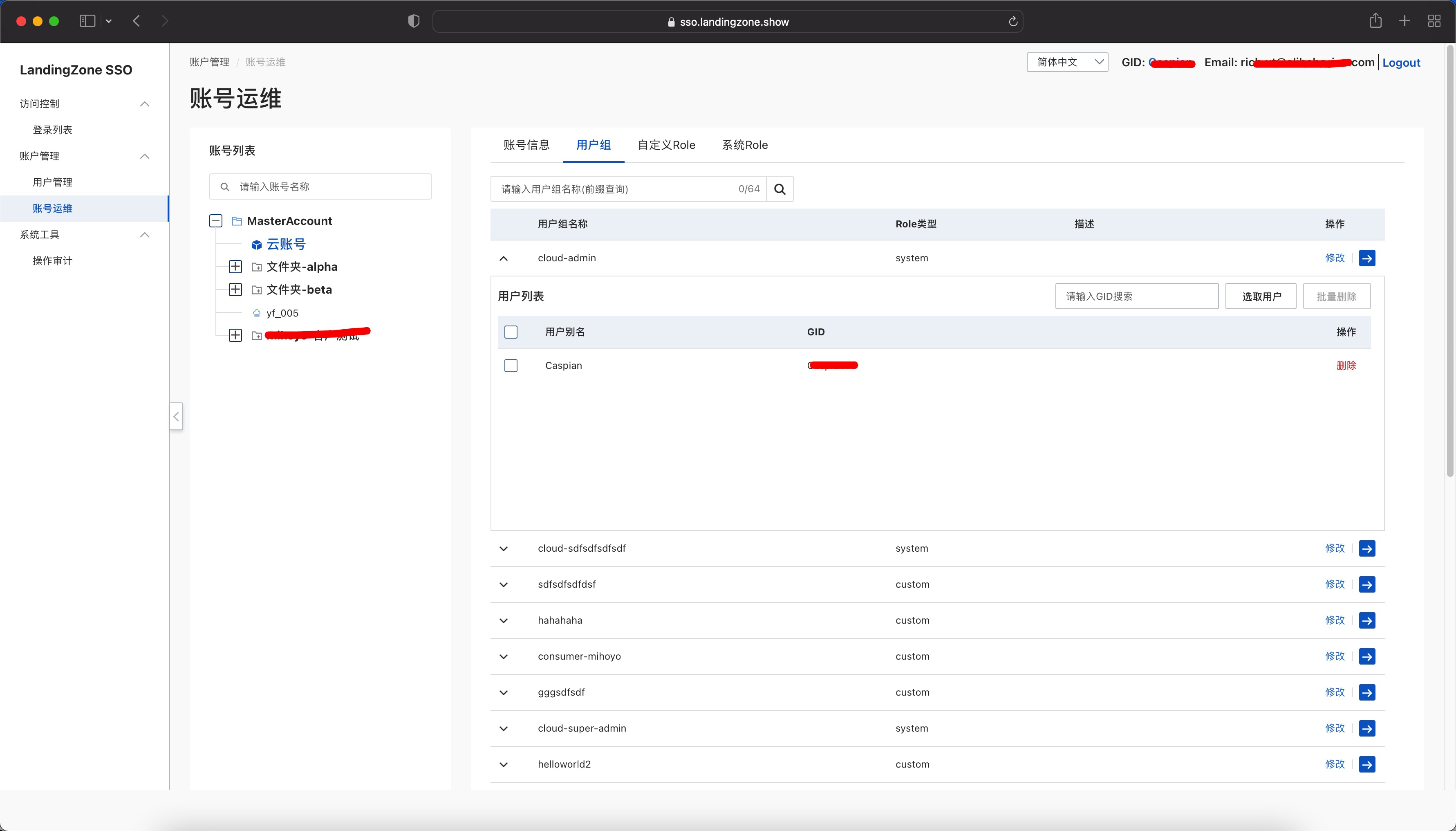 账号结点视角包含账户信息,用户组(账号结点下自定义Role一对一的用户组),云账号下自定义Role三个模块。
