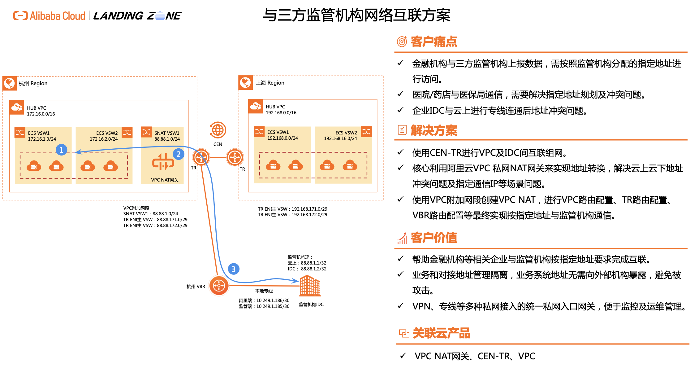 云上VPC与三方金融等监管机构互联场景下,应监管机构网段要求,存在如下两个需求: