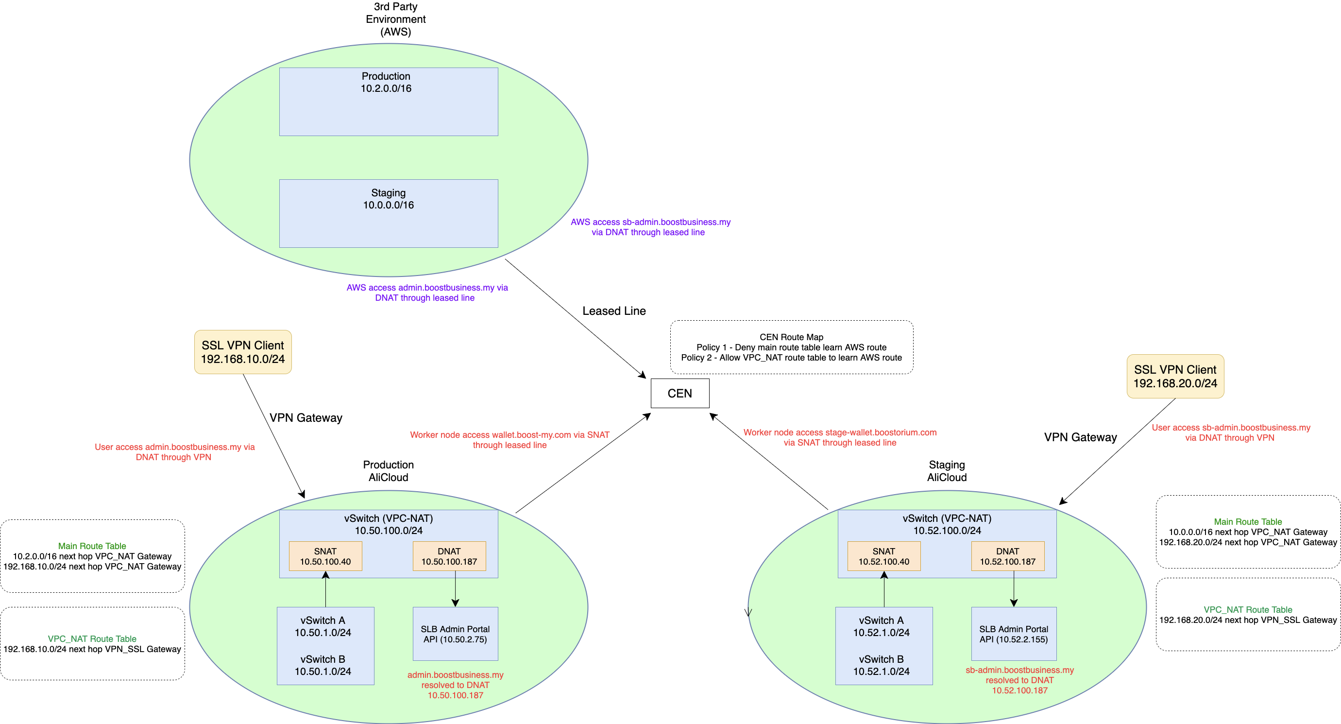 - 部署两个独立的SNAT网关和DNAT网关,同时需要利用CEN-TR的静态路由能力来实现流量的引流。