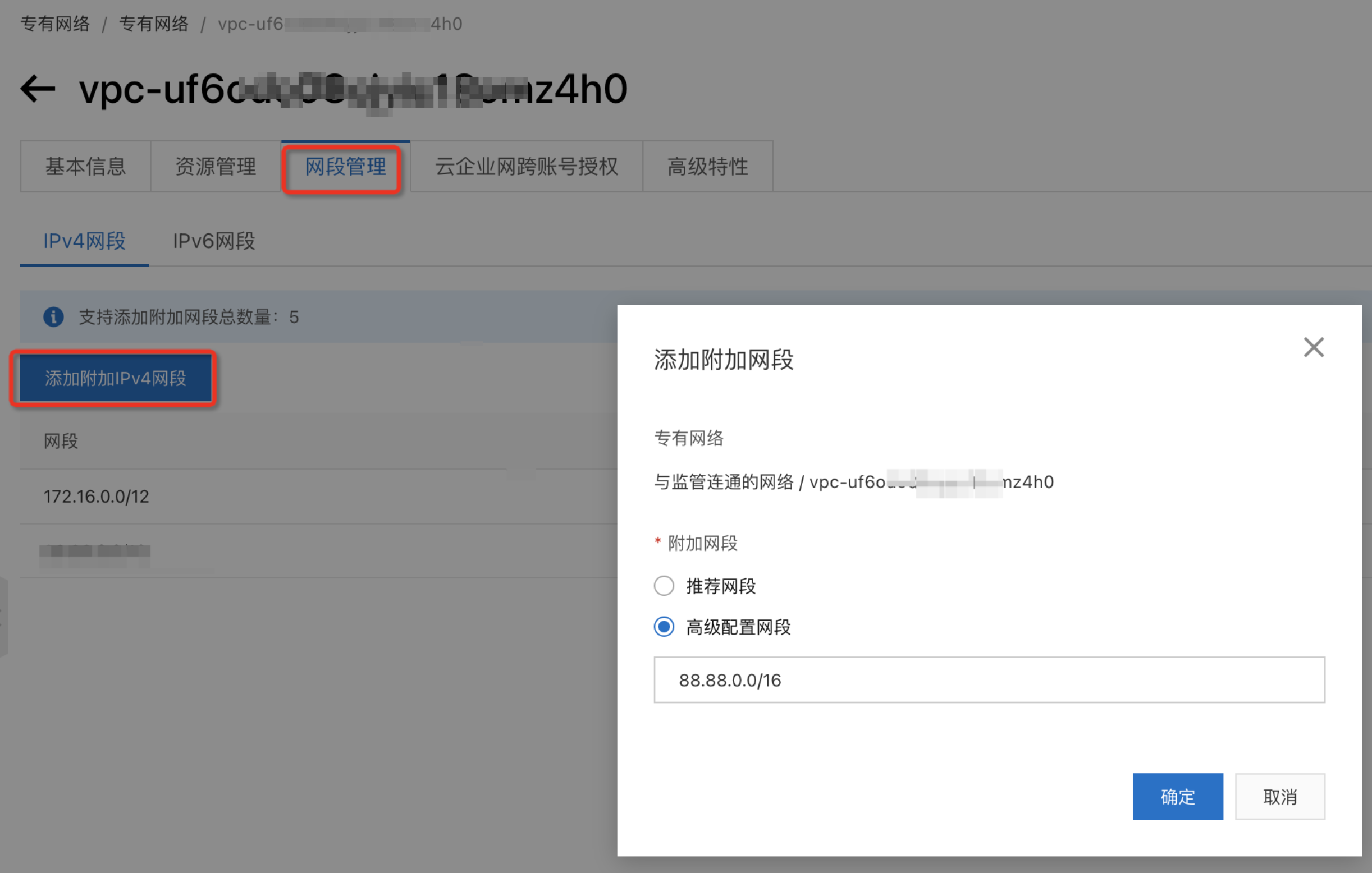 登录VPC控制台,在要与监管机构连通的VPC详情页面添加附加公网私用的网段,本示例输入88.88.0.0/16。