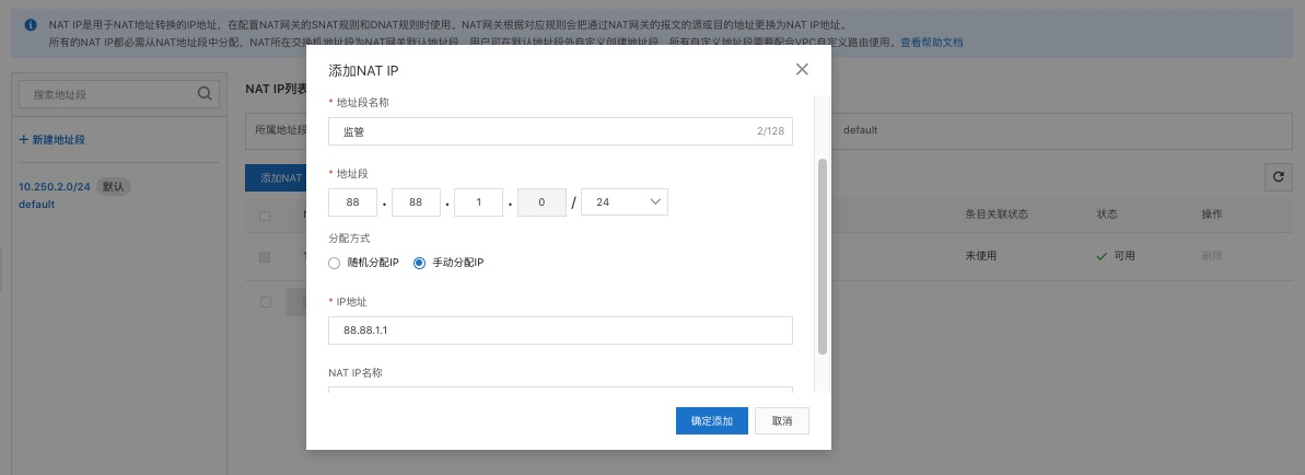 - NAT IP地址是在SNAT功能或DNAT功能中用于源或目的地址转换的IP地址。VPC NAT网关创建成功后,系统会使用VPC NAT网关所在交换机的网段作为默认NAT IP地址段,使用默认NAT IP地址段中的一个IP地址作为默认NAT IP地址。您可以在默认地址段中添加NAT IP地址,也可以新建地址段并添加NAT IP地址。