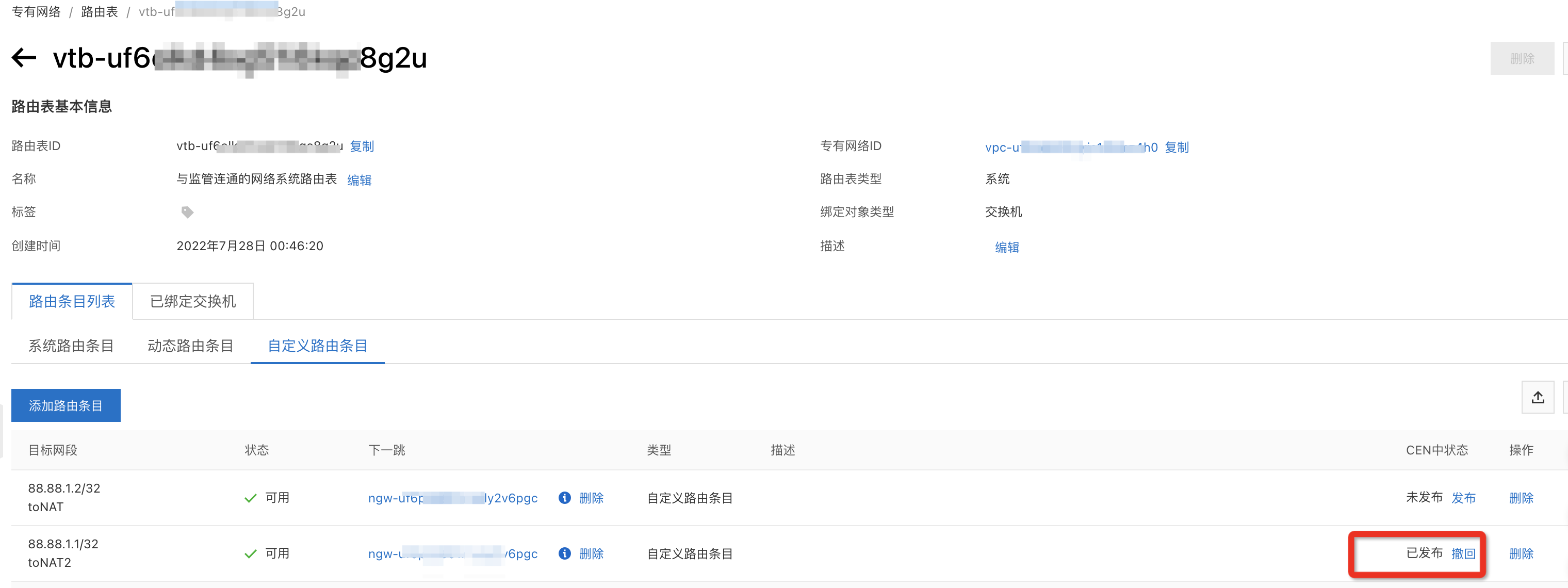 - 将自定义路由表绑定到NAT网关所在交换机,具体操作可参考绑定交换机和自定义路由表。
