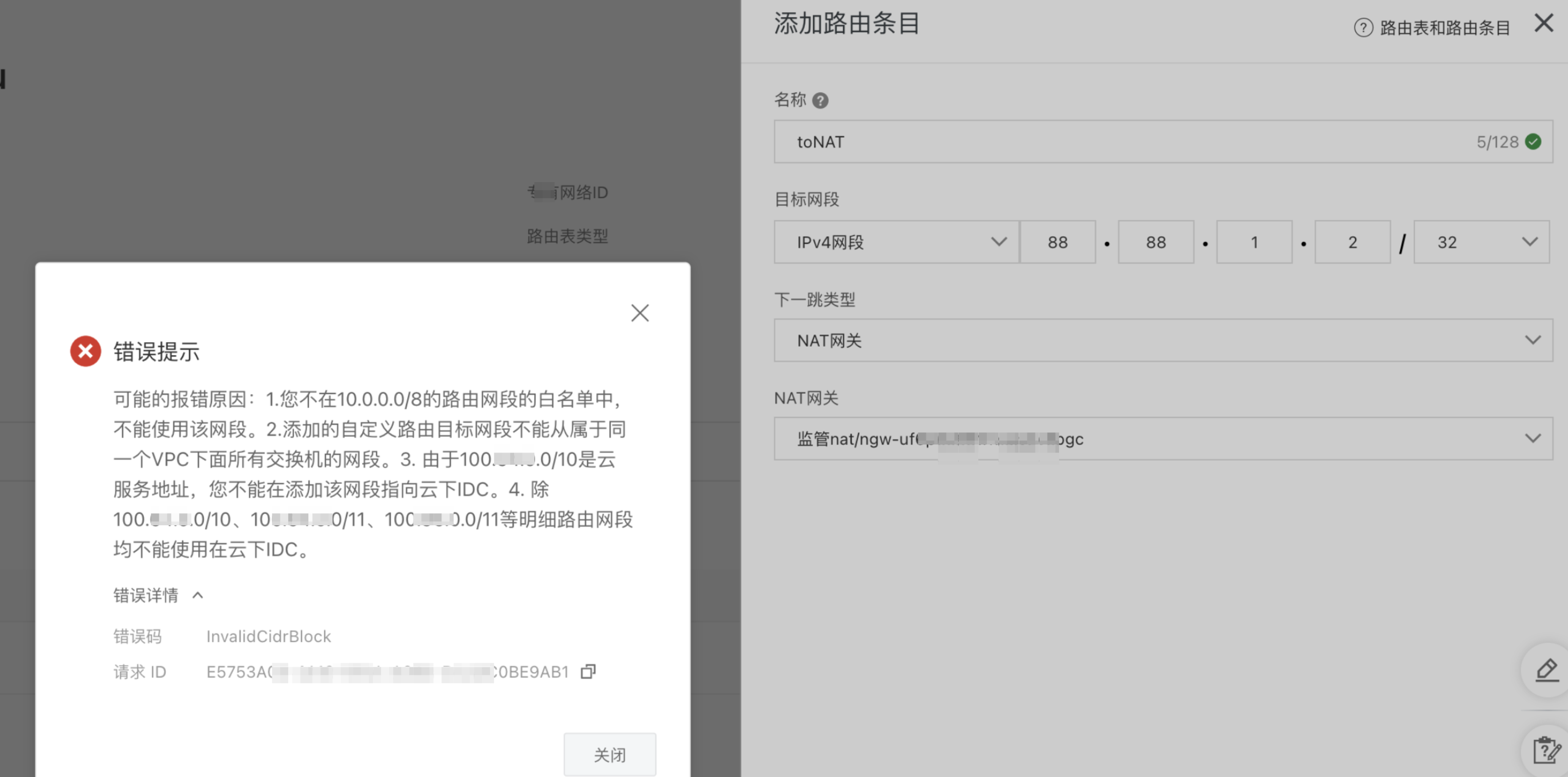 配置VPC路由表公网私用路由报错