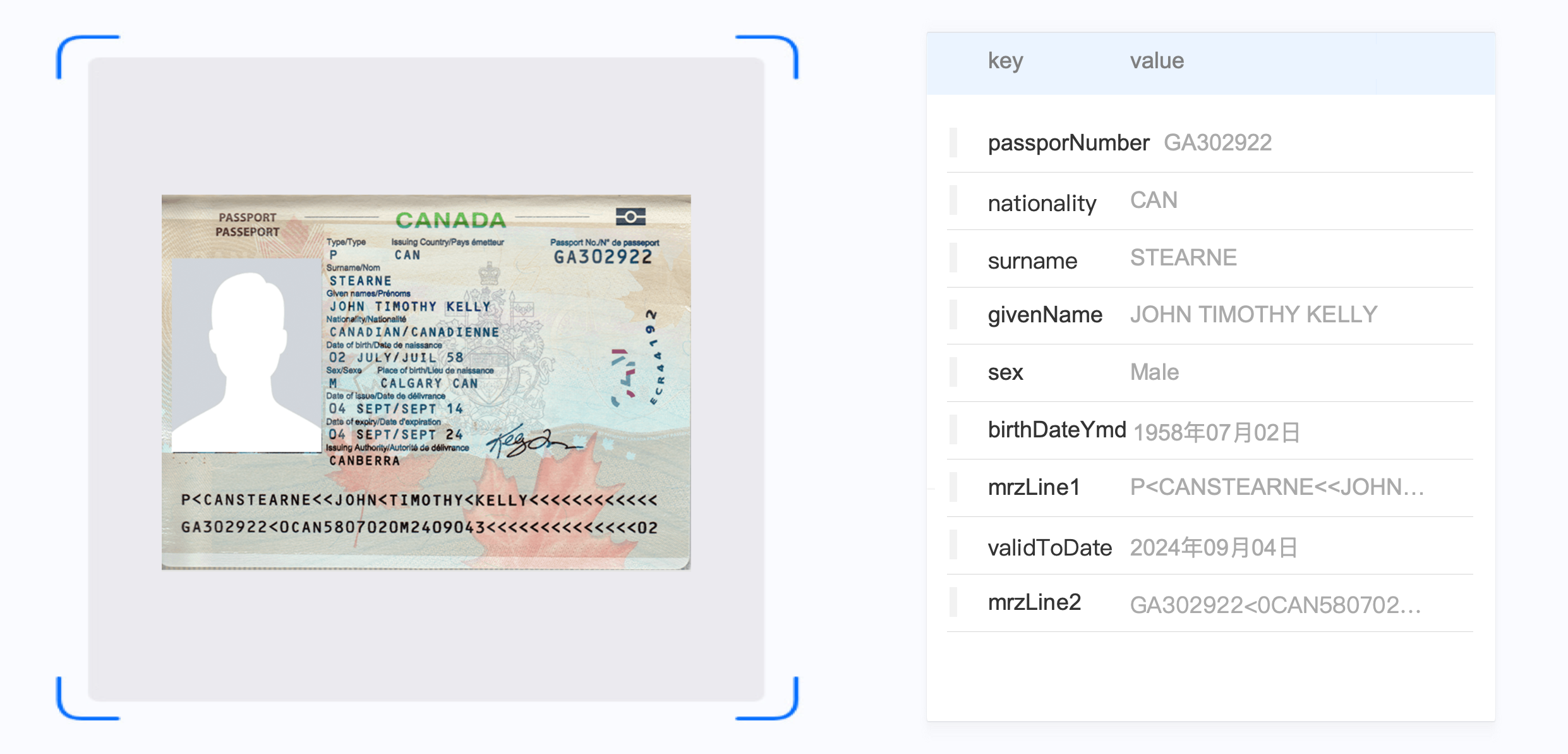 可对美国、法国、英国、日本、韩国等世界多个主要国家和地区护照提供识别服务,支持字段包括国籍、护照号码、出生日期、姓名等。