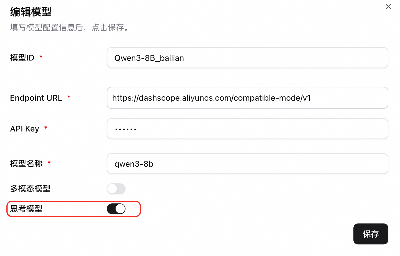 模型ID:对话时用于选择不同的模型。这里填写Qwen3-8B_bailian。