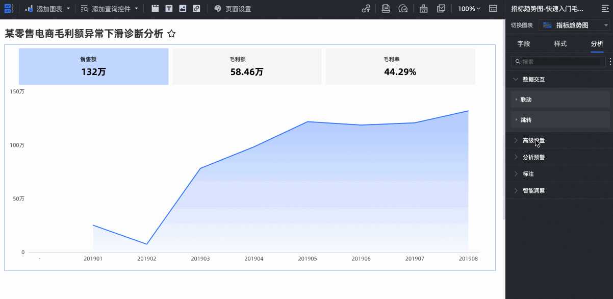 为了更好地展示各个月份销售额、毛利额、毛利率三个关键指标的走势数据,推荐您选择指标趋势图进行呈现。