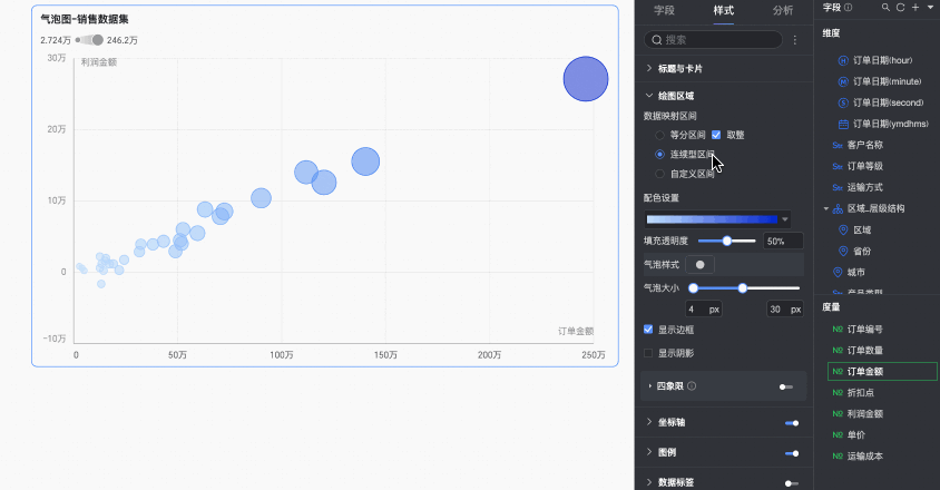 在绘图区域中,设置配色、气泡大小和开启四象限功能。当字段面板中配置的字段不同时,支持操作的配置项不同。