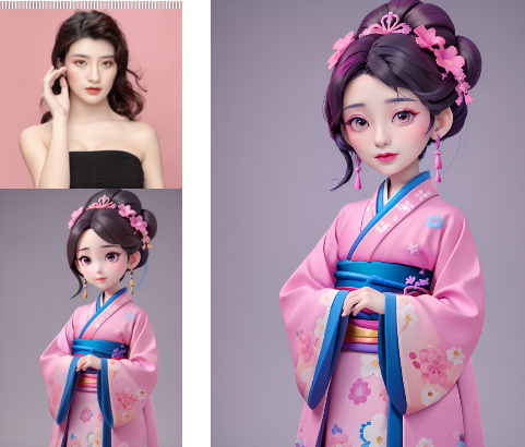 - 3D卡通形象图(左侧为输入的人像图片+卡通形象图片,右侧为输出的效果图)